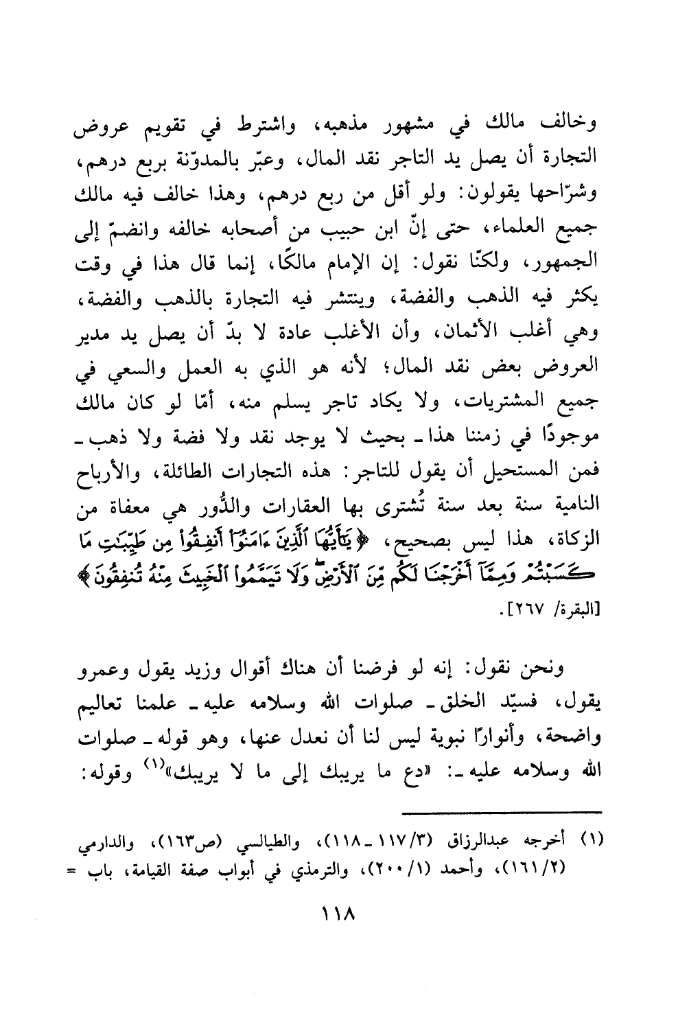 وخالف مالك في مشهور مذهبه، واشترط في تقويم عروض التجارة أن يصل يد التاجر نقد المال، وعثر بالمدوّنة بربع درهم، وشرّاحها يقولون: ولو أقل من ربع درهم، وهذا خالف فيه مالك جميع العلماء، حتى إنّ ابن حبيب من أصحابه خالفه وانضمّ إلى الجمهور، ولكنّا نقول: إن الإمام مالكًا، إنما قال هذا في وقت يكثر فيه الذهب والفضة، وينتشر فيه التجارة بالذهب والفضة، وهي أغلب الأثمان، وأن الأغلب عادة لا بدّ أن يصل يد مدير العروض بعض نقد المال؛ لأنه هو الذي به العمل والسعي في جميع المشتريات، ولا يكاد تاجر يسلم منه، أنها لو كان مالك موجودًا في زمننا هذا -بحيث لا يوجد نقد ولا فضة ولا ذهب- فمن المستحيل أن يقول للتاجر: هذه التجارات الطائلة، والأرباح النامية سنة بعد سنة تُشترى بها العقارات والدُّور هي معفاة من الزكاة، هذا ليس بصحيح، {يَا أَيُّهَا الَّذِينَ آمَنُوا أَنْفِقُوا مِنْ طَيِّبَاتِ مَا كَسَبْتُمْ وَمِمَّا أَخْرَجْنَا لَكُمْ مِنَ الْأَرْضِ وَلَا تَيَمَّمُوا الْخَبِيثَ مِنْهُ تُنْفِقُونَ} [البقرة: 267].