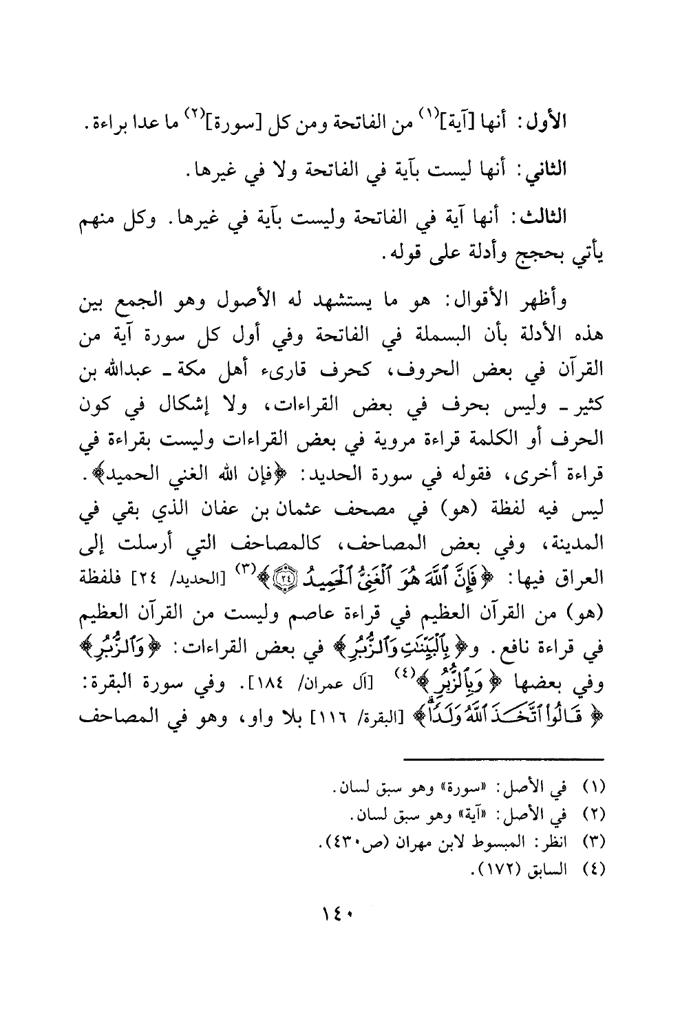 وأظهر الأقوال: هو ما يستشهد له الأصول وهو الجمع بين هذه الأدلة بأن البسملة في الفاتحة وفي أول كل سورة آية من القرآن في بعض الحروف، كحرف قارئ أهل مكة -عبد الله بن كثير- وليس بحرف في بعض القراءات، ولا إشكال في كون الحرف أو الكلمة قراءة مروية في بعض القراءات وليست بقراءة في قراءة أخرى، فقوله في سورة الحديد: {فَإِنَّ اللَّهَ هُوَ الْغَنِيُّ الْحَمِيدُ}. ليس فيه لفظة (هو) في مصحف عثمان بن عفان الذي بقي في المدينة، وفي بعض المصاحف، كالمصاحف التي أرسلت إلى العراق فيها: {فَإِنَّ اللَّهَ هُوَ الْغَنِيُّ الْحَمِيدُ} (¬3) [الحديد: 24] فلفظة (هو) من القرآن العظيم في قراءة عاصم وليست من القرآن العظيم في قراءة نافع. و {بِالْبَيِّنَاتِ وَالزُّبُرِ} في بعض القراءات: {وَالزُّبُرِ} وفي بعضها {بالزُّبُرِ} (¬4) [آل عمران / 184]. وفي سورة البقرة: {وَقَالُوا اتَّخَذَ اللَّهُ وَلَدًا} [البقرة: 116] بلا واو، وهو في المصاحف