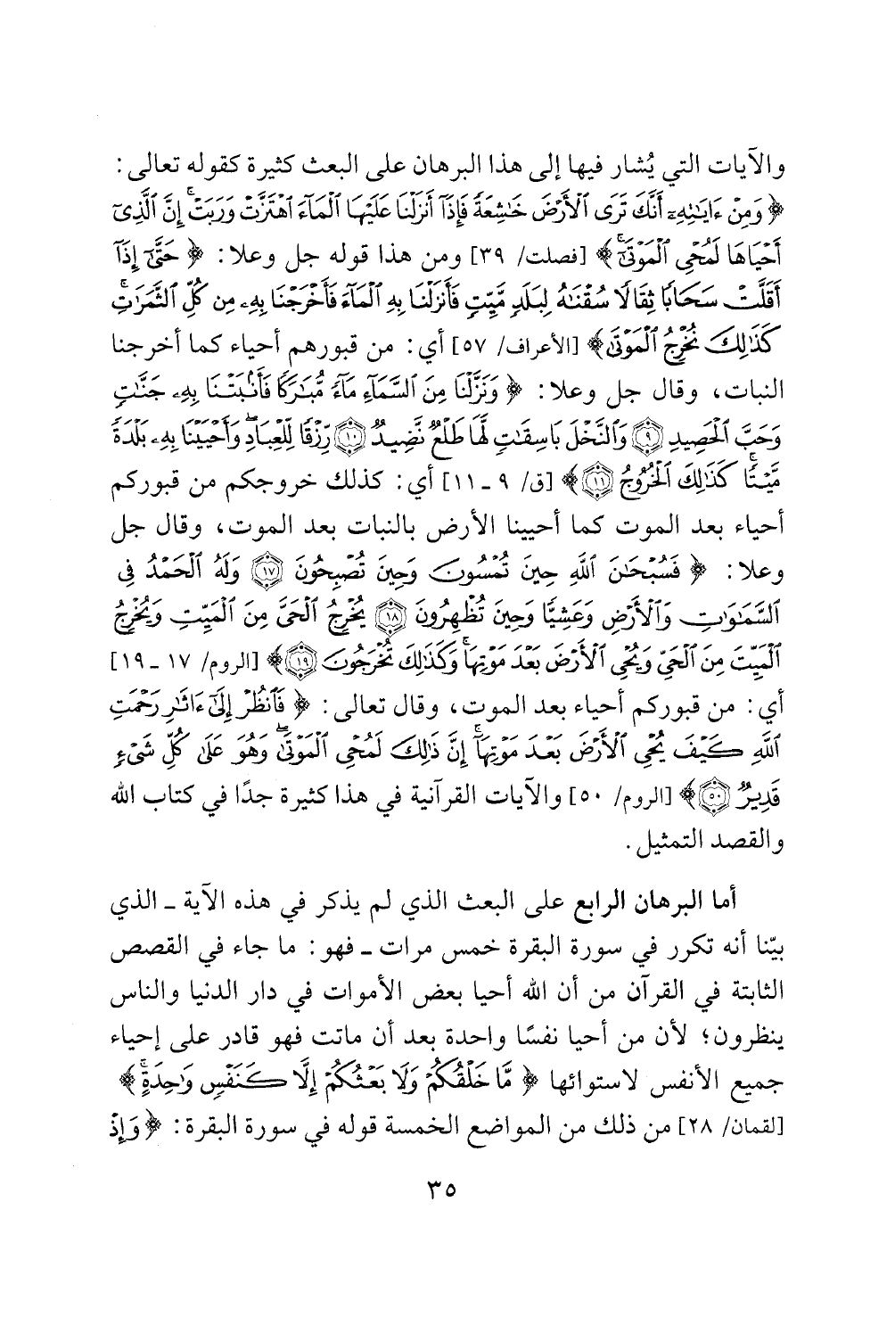 والآيات التي يُشار فيها إلى هذا البرهان على البعث كثيرة كقوله تعالى: {وَمِنْ آيَاتِهِ أَنَّكَ تَرَى الْأَرْضَ خَاشِعَةً فَإِذَا أَنْزَلْنَا عَلَيهَا الْمَاءَ اهْتَزَّتْ وَرَبَتْ إِنَّ الَّذِي أَحْيَاهَا لَمُحْيِ الْمَوْتَى} [فصلت: / 39] ومن هذا قوله جل وعلا: {حَتَّى إِذَا أَقَلَّتْ سَحَابًا ثِقَالًا سُقْنَاهُ لِبَلَدٍ مَيِّتٍ فَأَنْزَلْنَا بِهِ الْمَاءَ فَأَخْرَجْنَا بِهِ مِنْ كُلِّ الثَّمَرَاتِ كَذَلِكَ نُخْرِجُ الْمَوْتَى} [الأعراف / 57] أي: من قبورهم أحياء كما أخرجنا النبات، وقال جل وعلا: {وَنَزَّلْنَا مِنَ السَّمَاءِ مَاءً مُبَارَكًا فَأَنْبَتْنَا بِهِ جَنَّاتٍ وَحَبَّ الْحَصِيدِ (9) وَالنَّخْلَ بَاسِقَاتٍ لَهَا طَلْعٌ نَضِيدٌ (10) رِزْقًا لِلْعِبَادِ وَأَحْيَينَا بِهِ بَلْدَةً مَيتًا كَذَلِكَ الْخُرُوجُ (11)} [ق / 9 - 11] كذلك خروجكم من قبوركم أحياء بعد الموت كما أحيينا الأرض بالنبات بعد الموت، وقال جل وعلا: {فَسُبْحَانَ اللَّهِ حِينَ تُمْسُونَ وَحِينَ تُصْبِحُونَ (17) وَلَهُ الْحَمْدُ فِي السَّمَاوَاتِ وَالْأَرْضِ وَعَشِيًّا وَحِينَ تُظْهِرُونَ (18) يُخْرِجُ الْحَيَّ مِنَ الْمَيِّتِ وَيُخْرِجُ الْمَيِّتَ مِنَ الْحَيِّ وَيُحْيِ الْأَرْضَ بَعْدَ مَوْتِهَا وَكَذَلِكَ تُخْرَجُونَ (19)} [الروم / 17 - 19] أي: من قبوركم أحياء بعد الموت، وقال تعالى: {فَانْظُرْ إِلَى آثَارِ رَحْمَتِ اللَّهِ كَيفَ يُحْيِ الْأَرْضَ بَعْدَ مَوْتِهَا إِنَّ ذَلِكَ لَمُحْيِ الْمَوْتَى وَهُوَ عَلَى كُلِّ شَيءٍ قَدِيرٌ (50)} [الروم / 50] والآيات القرآنية في هذا كثيرة جدًّا في كتاب الله والقصد التمثيل.