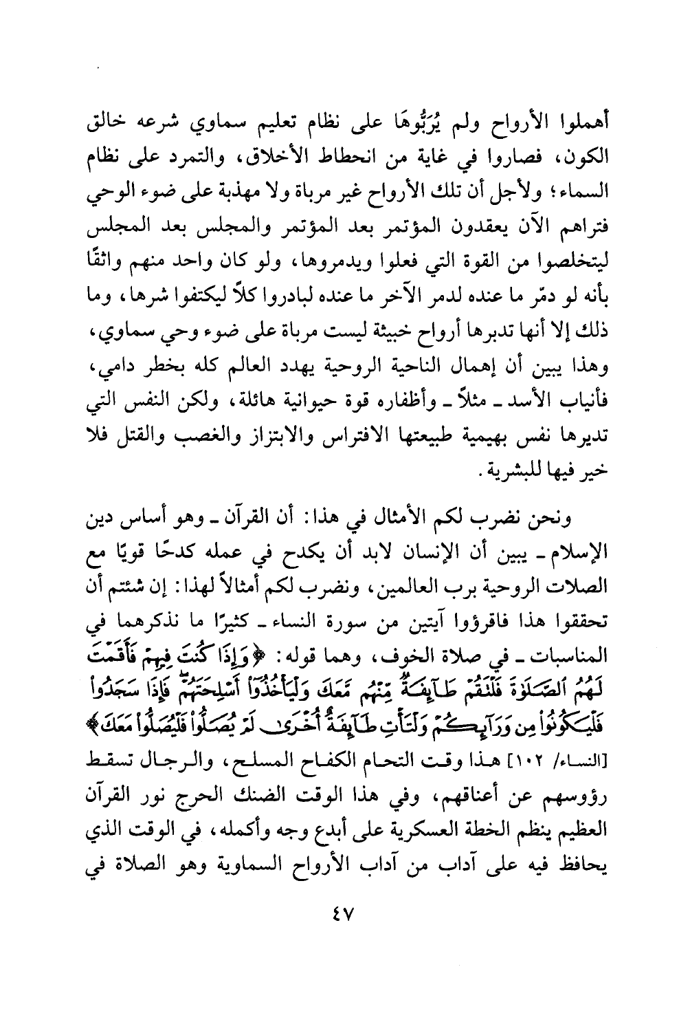 ونحن نضرب لكم الأمثال في هذا: أن القرآن -وهو أساس دين الإسلام- يبين أن الإنسان لا بد أن يكدح في عمله كدحًا قويًّا مع الصلات الروحية برب العالمين، ونضرب لكم أمثالًا لهذا: إن شئتم أن تحققوا هذا فاقرؤوا آيتين من سورة النساء -كثيرًا ما نذكرهما في المناسبات- في صلاة الخوف، وهما قوله: {وَإِذَا كُنْتَ فِيهِمْ فَأَقَمْتَ لَهُمُ الصَّلَاةَ فَلْتَقُمْ طَائِفَةٌ مِنْهُمْ مَعَكَ وَلْيَأْخُذُوا أَسْلِحَتَهُمْ فَإِذَا سَجَدُوا فَلْيَكُونُوا مِنْ وَرَائِكُمْ وَلْتَأْتِ طَائِفَةٌ أُخْرَى لَمْ يُصَلُّوا فَلْيُصَلُّوا مَعَكَ} [النساء / 102] هذا وقت التحام الكفاح المسلح، والرجال تسقط رؤوسهم من أعناقهم، وفي هذا الوقت الضنك الحرج نور القرآن العظيم ينظم الخطبة العسكرية على أبدع وجه وأكمله، في الوقت الذي يحافظ فيه على آداب من آداب الأرواح السماوية وهو الصَّلاة في