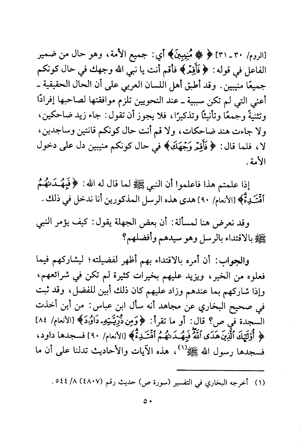 [الروم / 30 - 31] {مُنِيبِينَ} أي: جميع الأمة، وهو حال من ضمير الفاعل في قوله: {فَأقِمْ} فأقم أنت يا نبي الله وجهك في حال كونكم جميعًا منيبين. وقد أطبق أهل اللسان العربي على أن الحال الحقيقية -أعني التي لم تكن سببية- عند النَّحويين تلزم موافقتها لصاحبها إفرادًا وتثنيةً وجمعًا وتأنيثًا وتذكيرًا، فلا يجوز أن تقول: جاء زيد ضاحكين، ولا جاءت هند ضاحكات، ولا قم أنت حال كونكم قانتين وساجدين، لا، فلما قال: {فَأَقِمْ وَجْهَكَ} في حال كونكم منيبين دل على دخول الأمة.