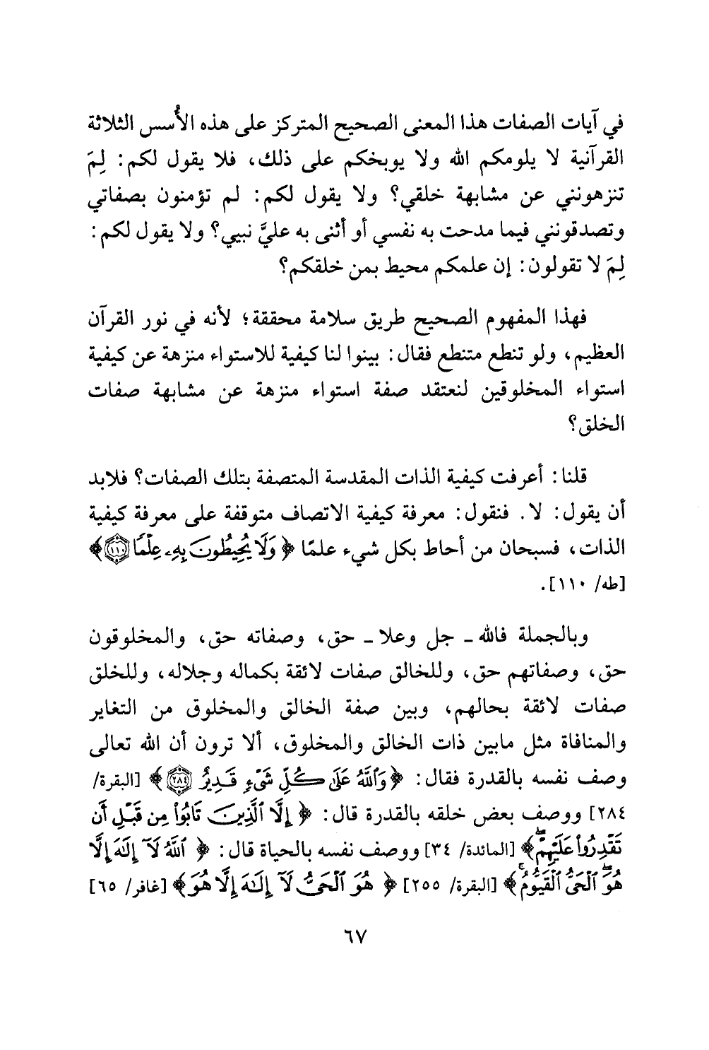 قلنا: أعرفت كيفية الذات المقدسة المتصفة بتلك الصفات؟ فلا بد أن يقول: لا. فنقول: معرفة كيفية الاتصاف متوقفة على معرفة كيفية الذات، فسبحان من أحاط بكل شيء علمًا {وَلَا يُحِيطُونَ بِهِ عِلْمًا (110)} [طه: 110].