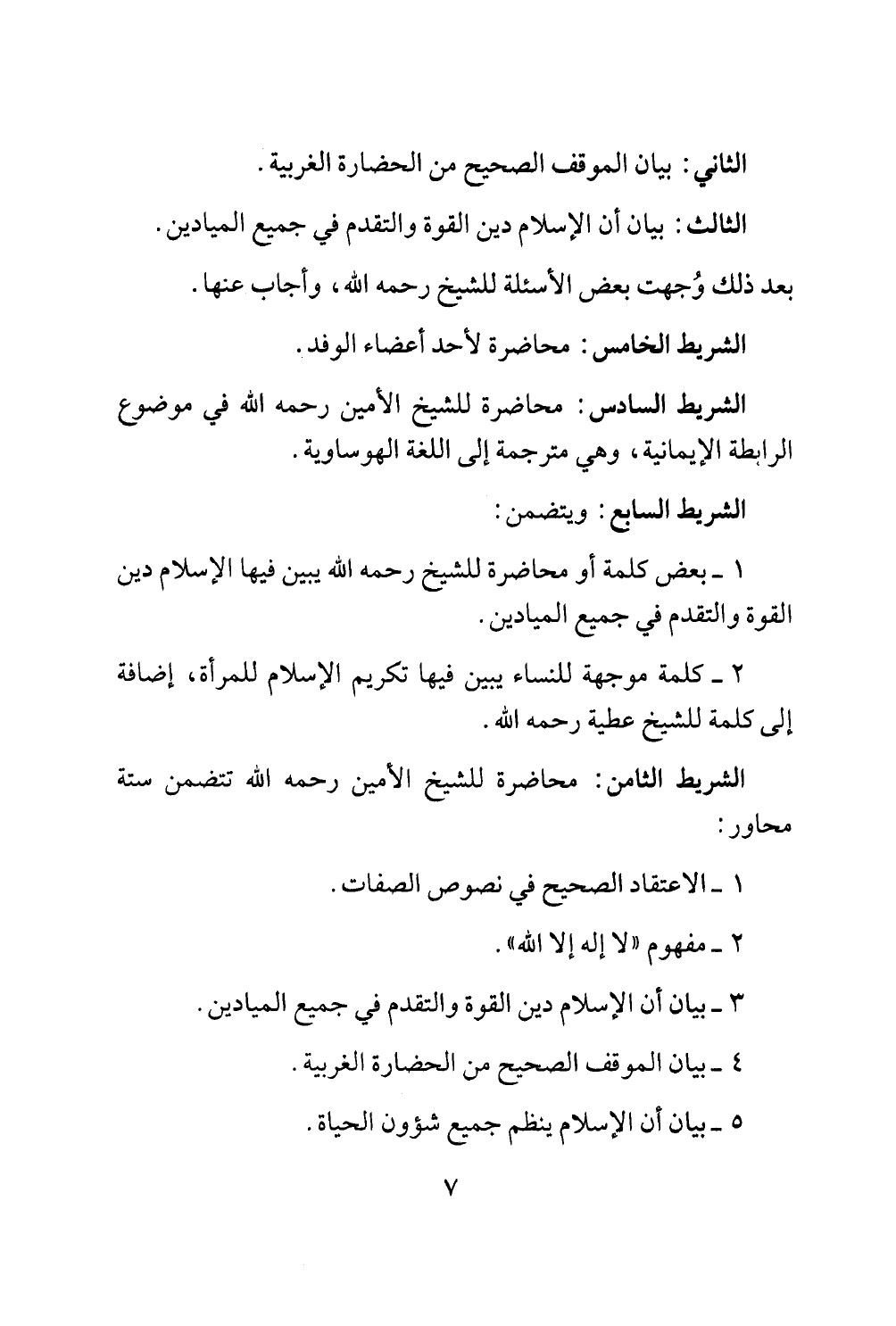 الشريط السادس: محاضرة للشَّيخ الأمين رحمه الله في موضوع الرابطة الإيمانية، وهي مترجمة إلى اللُّغة الهوساوية.