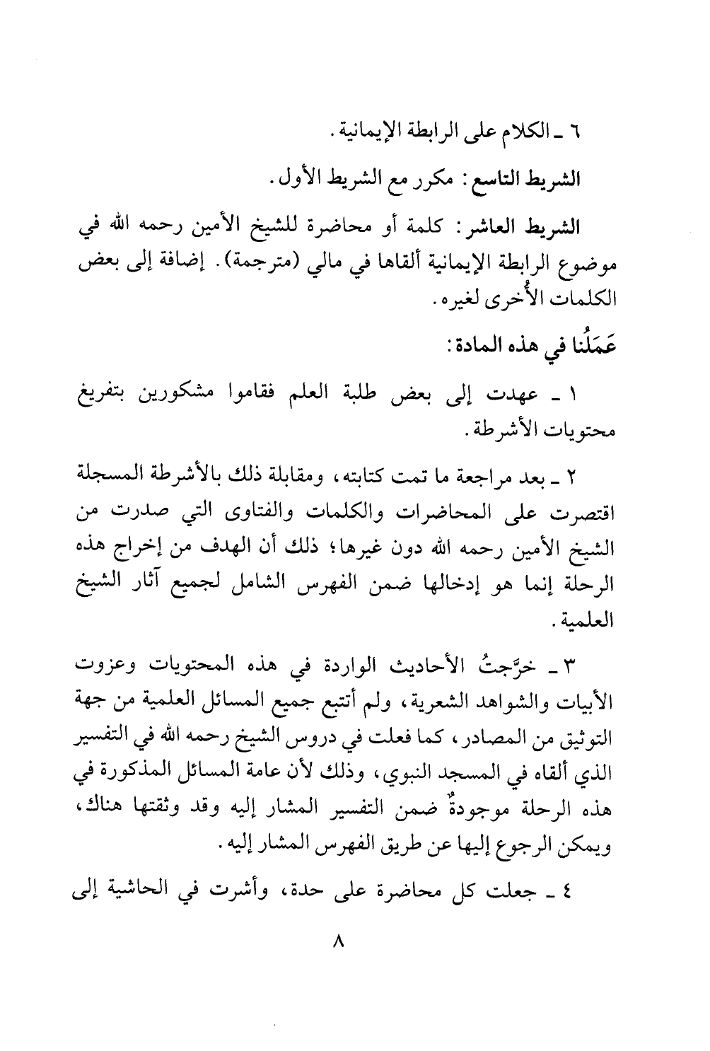 2 - بعد مراجعة ما تمت كتابته، ومقابلة ذلك بالأشرطة المسجلة اقتصرت على المحاضرات والكلمات والفتاوى التي صدرت من الشَّيخ الأمين رحمه الله دون غيرها، ذلك أن الهدف من إخراج هذه الرحلة إنَّما هو إدخالها ضمن الفهرس الشامل لجميع آثار الشَّيخ العلمية.