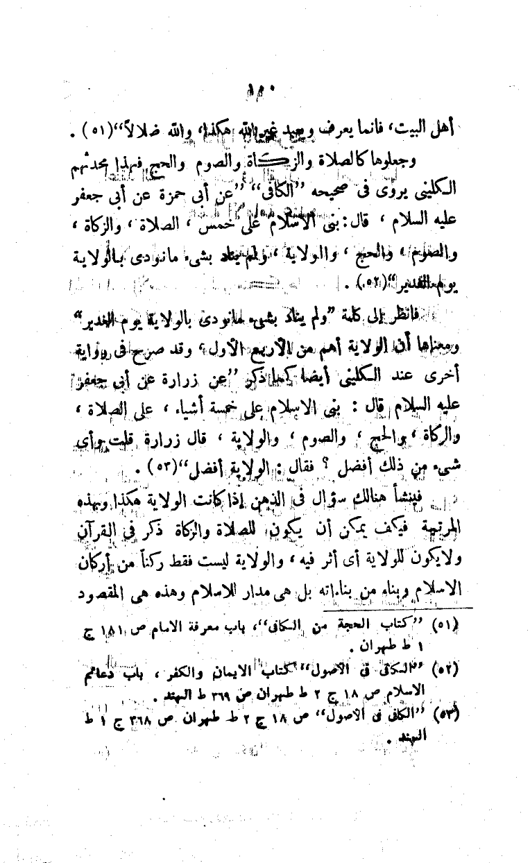 فانظر إلى كلمة "ولم يناد بشيء ما نودي بالولاية يوم الغدير" ومعناها أن الولاية أهم من الأربع الأول، وقد صرح في رواية أخرى عند الكليني أيضاً كما ذكر "عن زرارة عن أبي جعفر عليه السلام قال: بني الإسلام على خمسة أشياء، على الصلاة، والزكاة، والحج، والصوم، والولاية، قال زرارة قلت وأي شيء من ذلك أفضل؟ فقال: الولاية أفضل" (¬3).