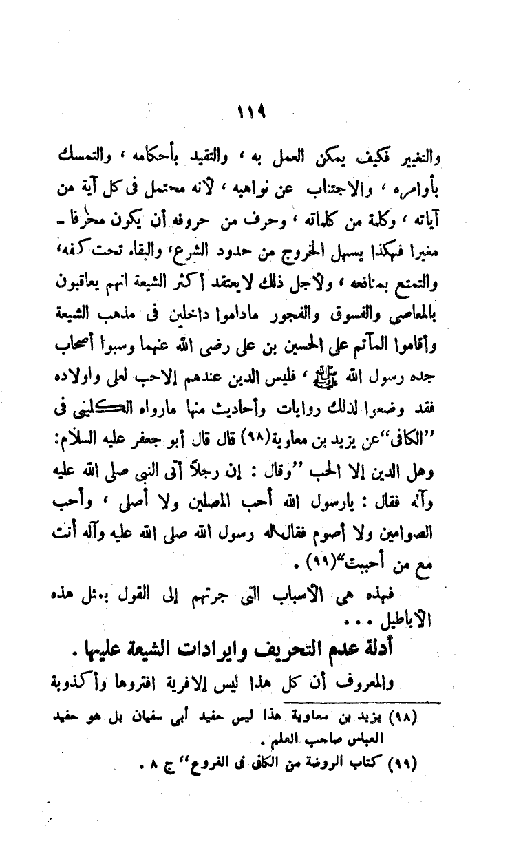 والتغيير فكيف يمكن العمل به، والتقيد بأحكامه، والتمسك بأوامره، والاجتناب عن نواهيه، لأنه محتمل في كل آية من آياته، وكلمة من كلماته، وحرف من حروفه أن يكون محرفاً مغيراً فهكذا يسهل الخروج من حدود الشرع، والبقاء تحت كفه، والتمتع بمنافعه، ولأجل ذلك لا يعتقد أكثر الشيعة أنهم يعاقبون بالمعاصي والفسوق والفجور ما داموا داخلين في مذهب الشيعة وأقاموا المآتم على الحسين بن علي رضي الله عنهما وسبوا أصحاب جده رسول الله، فليس الدين عندهم إلا حب لعلي وأولاده فقد وضعوا لذلك روايات وأحاديث منها ما رواه الكليني في "الكافي" عن يزيد بن معاوية (¬1) قال قال أبو جعفر عليه السلام: وهل الدين إلا الحب" وقال: إن رجلاً أتى النبي صلى الله عليه وآله فقال: يا رسول الله أحب المصلين ولا أصلي، وأحب الصوامين ولا أصوم فقال له رسول الله صلى الله عليه وآله أنت مع من أحببت" (¬2).