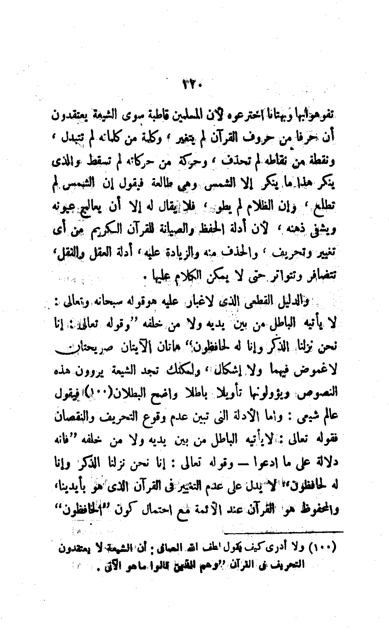 تفوهوا بها وبهتاناً اخترعوه لأن المسلمين قاطبة سوى الشيعة يعتقدون أن حرفاً من حروف القرآن لم يتغير، وكلمة من كلماته لم تتبدل، ونقطة من نقاطه لم تحذف، وحركة من حركاته لم تسقط والذي ينكر هذا ما ينكر إلا الشمس وهي طالعة فيقول إن الشمس لم تطلع، وإن الظلام لم يطو، فلا يقال له إلا أن يعالج عيونه ويشفى ذهنه، لأن أدلة الحفظ والصيانة للقرآن الكريم من أي تغيير وتحريف، والحذف منه والزيادة عليه، أدلة العقل والنقل، تتضافر وتتواتر حتى لا يمكن الكلام عليها.