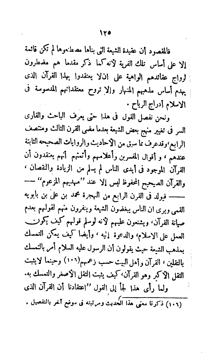 ونحن نفصل القول في هذا حتى يعرف الباحث والقارئ السر في تغيير منهج بعض الشيعة بعدما مضى القرن الثالث ومنتصف الرابع، وقد عرف مما سبق من الأحاديث والروايات الصحيحة الثابتة عندهم، وأقوال المفسرين وأعلامهم وأئمتهم أنهم يعتقدون أن القرآن الموجود في أيدي الناس لم يسلم من الزيادة والنقصان، والقرآن الصحيح المحفوظ ليس إلا عند "مهديهم المزعوم" --- فيولد في لاقرن الرابع نم الهجرة محمد بن علي بن بابويه القمي ويرى أن الناس يبغضون الشيعة وينفرون منهم لقولهم بعدم صيانة القرآن، ويشنعون عليهم لأنه لو سلم قولهم كيف يكون العمل على الإسلام، والدعوة إليه، وأيضاً كيف يمكن التمسك بمذهب الشيعة حيث يقولون أن الرسول عليه السلام أمر بالتمسك بالثقلين، القرآن وأهل البيت حسب زعمهم (¬1) وحينما لا يثبت الثقل الأكبر وهو القرآن، كيف يثبت الثقل الأصغر والتمسك به.
