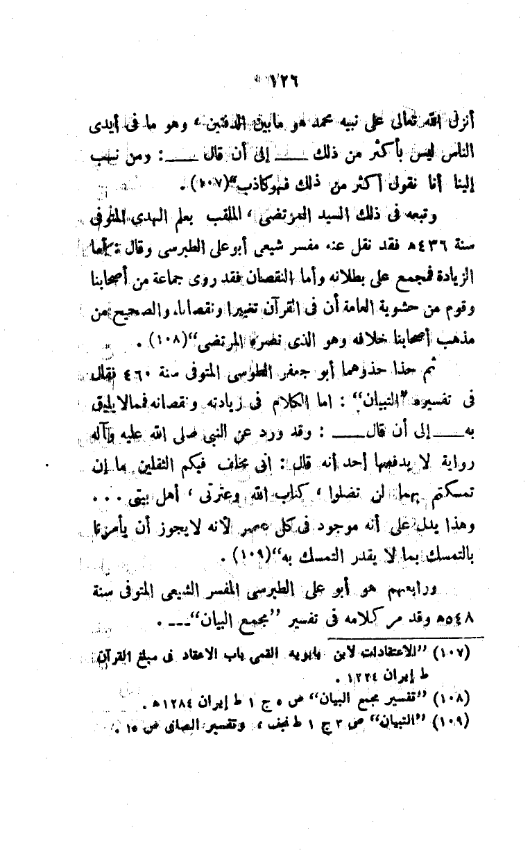 ثم حذا حذوهما أبو جعفر الطوسي المتوفى سنة 460 فقال في تفسيره "التبيان": أما الكلام في زيادته ونقصانه فمما لا يليق به -- إلى أن قال --: وقد ورد عن النبي صلى الله عليه وآله رواية لا يدفعها أحد أنه قال: إني مخلف فيكم الثقلين ما إن تمسكتم بهما لن تضلوا، كتاب الله وعترتي، أهل بيتي. . . وهذا يدل على أنه موجود في كل عصر لأنه لا يجوز أن يأمرنا بالتمسك بما لا يقدر التمسك به" (¬3).