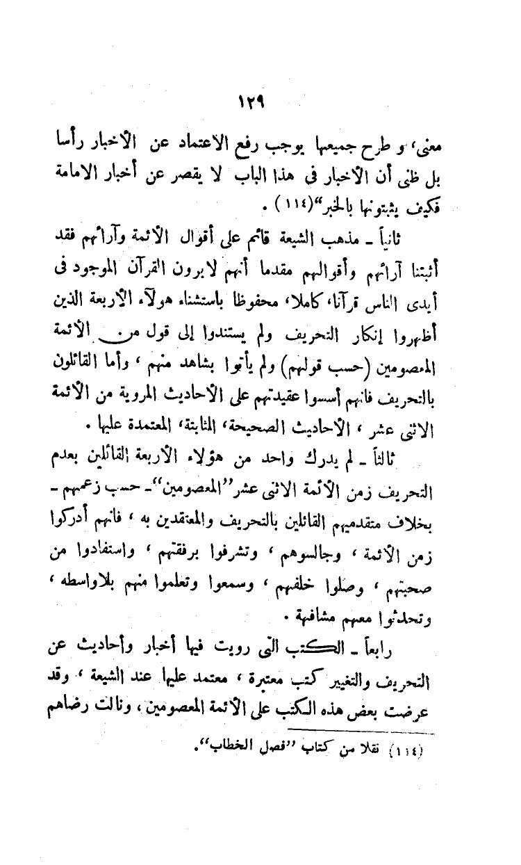 ثانياً: - مذهب الشيعة قائم على أقوال الأئمة وآرائهم فقد أثبتنا آرائهم وأقوالهم مقدماً أنهم لا يرون القرآن الموجود في أيدي الناس قرآناً، كاملاً، محفوظاً باستثناء هؤلاء الأربعة الذين أظهروا إنكار التحريف ولم يستندوا إلى قول من الأئمة المعصومين (حسب قولهم) ولم يأتوا بشاهد منهم، وأما القائلون بالتحريف فإنهم أسسوا عقيدتهم على الأحاديث المروية من الأئمة الاثني عشر، الأحاديث الصحيحة، الثابتة، المعتمدة عليها.