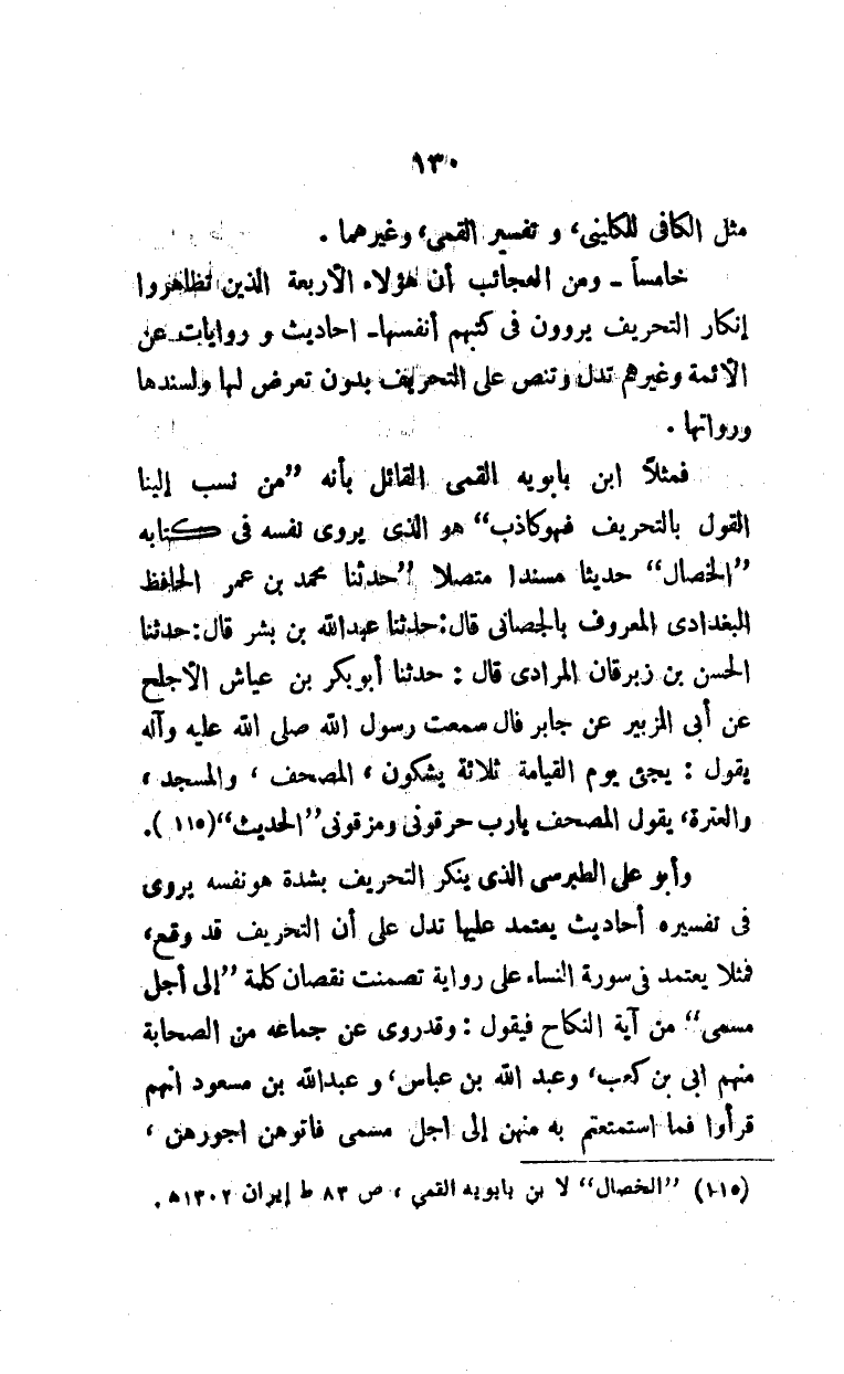 فمثلاً ابن بابويه القمي القائل بأنه "من نسب إلينا القول بالتحريف فهو كاذب" هو الذي يروي نفسه في كتابه "الخصال" حديثاً مسنداً متصلاً "حدثنا محمد بن عمر الحافظ البغدادي المعروف بالجصاني قال: حدثنا عبد الله بن بشر قال: حدثنا الحسن بن زبرقان المرادي قال: حدثنا أبو بكر بن عياش الأجلح عن أبي الزبير عن جابر قال سمعت رسول الله صلى الله عليه وآله يقول: يجيء يوم القيامة ثلاثة يشكون، المصحف، والمسجد، والعترة، يقول المصحف يا رب حرقوني ومزقوني "الحديث" (¬1).