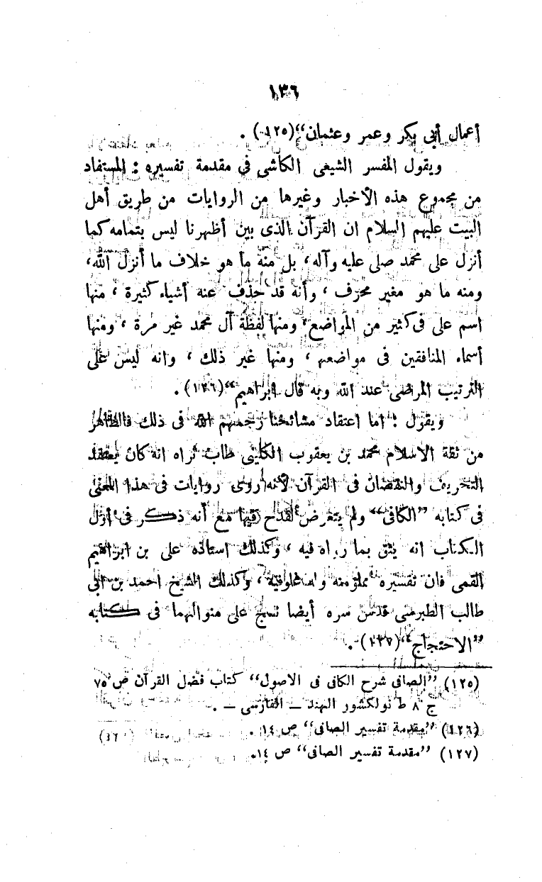 ويقول المفسر الشيعي الكاشي في مقدمة تفسيره: المستفاد من مجموع هذه الأخبار وغيرها من الروايات من طريق أهل البيت عليهم السلام أن القرآن الذي بين أظهرنا ليس بتمامه كما أنزل على محمد صلى الله عليه وآله، بل منه ما هو خلاف ما أنزل الله، ومنه ما هو مغير محرف، وأنه قد حذف عنه أشياء كثيرة، منها اسم علي في كثير من المواضع، ومنها لفظة آل محمد غير مرة، ومنها أسماء المنافقين في مواضعه، ومنها غير ذلك، وأنه ليس على الترتيب المرضى عند الله وبه قال إبراهيم" (¬2).