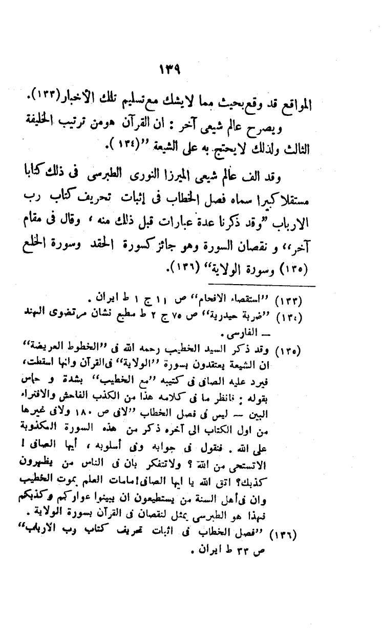 (¬4) "فصل الخطاب في إثبات تحريف كتاب رب الأرباب" ص33 ط إيران