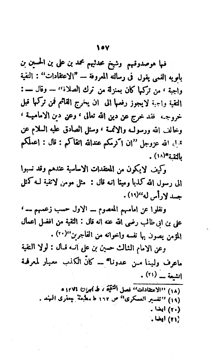 فها هو صدوقهم وشيخ محدثيهم محمد بن علي بن الحسين بن بابويه القمي يقول في رسالته المعروفة - "الاعتقادات": التقية واجبة، من تركها كان بمنزلة من ترك الصلاة" - وقال -: التقية واجبة لا يجوز رفعها إلى أن يخرج القائم فمن تركها قبل خروجه فقد خرج عن دين الله تعالى، وعن دين الإمامية، وخالف الله ورسوله والأئمة، وسئل الصادق عليه السلام عن قول الله عز وجل {إن أكرمكم عند الله أتقاكم} قال: أعملكم بالتقية" (¬1).