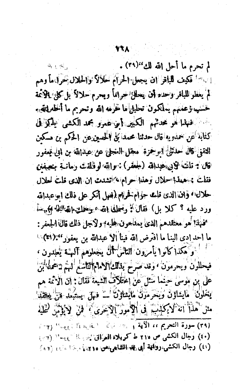 فهذا هو محدثهم الكبير أبو عمرو محمد الكشي يذكر في كتابه عن حمدويه قال حدثنا محمد بن الحسين عن الحكم بن مسكين الثقفي قال حدثني أبو حمزة معقل العجلي عن عبد الله بن أبي يعفور قال: قلت لأبي عبد الله (جعفر): والله لو فلقت رمانة بنصفين فقلت: هذا حلال وهذا حرام، نشدت إن الذي قلت حلال حلال، وأن الذي قلت حرام فحرام (فهل أنكر على ذلك أبو عبد الله ورد عليه؟ كلا بل) فقال: رحمك الله، رحمك الله" (¬2).