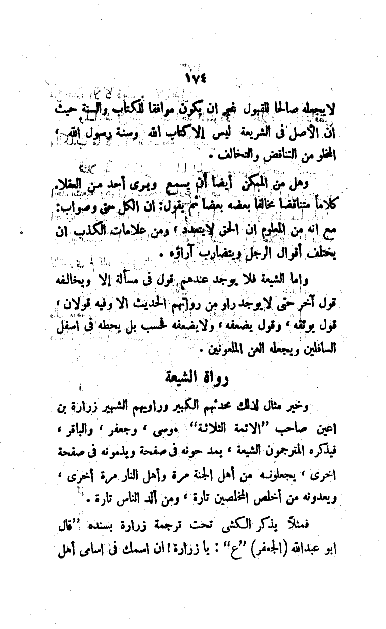 وخير مثال لذلك محدثهم الكبير وراويهم الشهير زرارة بن أعين صاحب "الأئمة الثلاثة" موسى، وجعفر، والباقر، وفيذكره المترجمون الشيعة، يمدحونه في صفحة ويذمونه في صفحة أخرى، يجعلونه من أهل الجنة مرة وأهل النار مرة أخرى، ويعدونه من أخلص المخلصين تارة، ومن ألد الناس تارة.