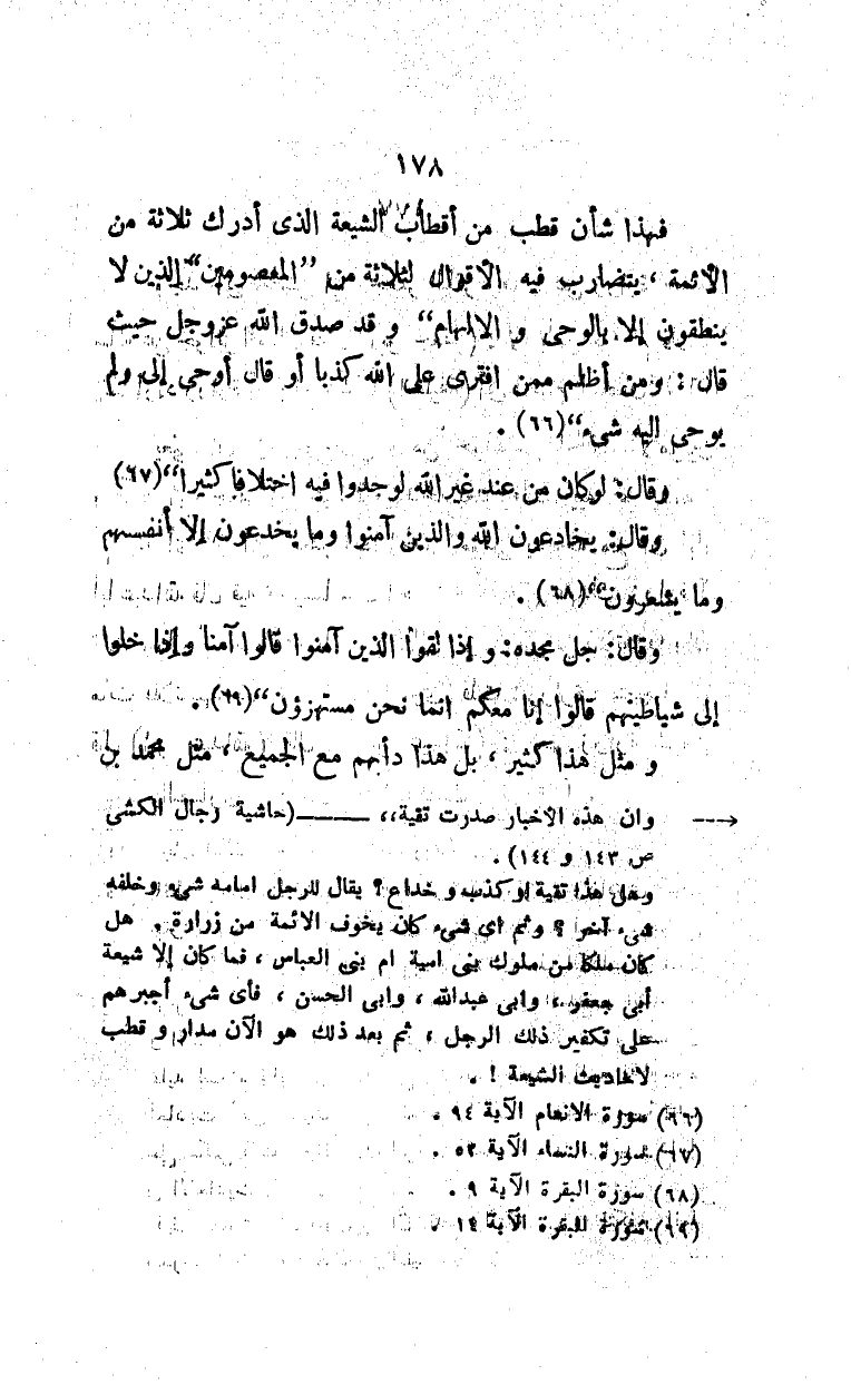 فهذا شأن قطب من أقطاب الشيعة الذي أدرك ثلاثة من الأئمة، يتضارب فيه الأقوال الثلاثة من "المعصومين" الذين لا ينطقون إلا بالوحي والإلهام" وقد صدق الله عز وجل حيث قال: ومن أظلم ممن افترى على الله كذباً أو قال أوحي إلي ولم يوحى إليه شيء" (¬1).