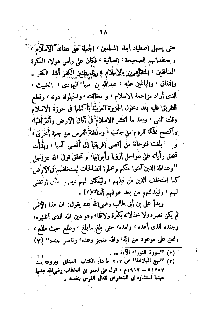 (¬2) "نهج البلاغة" ص203 ط دار الكتاب اللبناني بيروت، 1387هـ- 1967م، قول علي لعمر بن الخطاب رضي الله عنهما حينما استشاره في الشخوص لقتال الفرس بنفسه