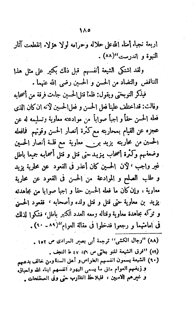 فيذكر النوبختي ويقول: فلما قتل الحسين جاءت فرقة من أصحابه وقالت: قد اختلف علينا فعل الحسن وفعل الحسين لأنه إن كان الذي فعله الحسن حقاً واجباً صواباً من موادعته معاوية وتسليمه له عن عجزه عن القيام بمحاربته مع كثرة أنصار الحسن وقوتهم فما فعله لاحسين من محاربته يزيد بن معاوية مع قلة أنصار الحسين وضعفهم وكثرة أصحاب يزيد حتى قتل وقتل أصحابه جميعاً باطل غير واجب، لأن الحسين كان أعذر في القعود عن محاربة يزيد وطلب الصلح والموادعة من الحسن في القعود عن محاربة معاوية، وإن كان ما فعله الحسين حقاً واجباً صواباً من مجاهدته يزيد بن معاوية حتى قتل وقتل ولده وأصحابه، فقعود الحسن وتركه مجاهدة معاوية وقتاله ومعه العدد الكثير باطل، فشكوا لذلك في إمامتهما ورجعوا فدخلوا في مقالة العوام" (¬2). (¬3).