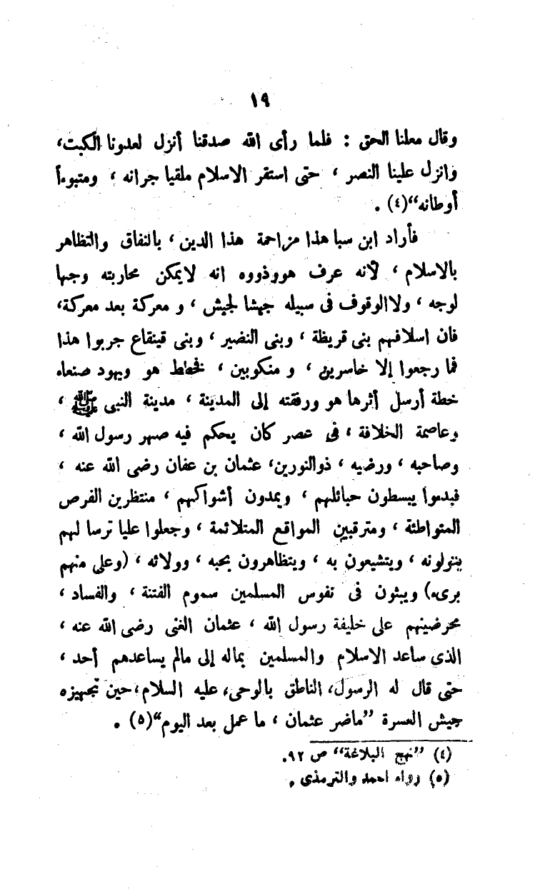 فأراد ابن سبأ هذا مزاحمة هذا لادين، بالنفاق والتظاهر بالإسلام، لأنه عرف هو وذووه أنه لا يمكن محاربته وجهاً لوجه، ولا الوقوف في سبيله جيشاً لجيش، ومعركة بعد معركة، فإن أسلافهم بني قريظة، بني النضير، وبني قينقاع جربوا هذا فما رجعوا إلا خاسرين، ومنكوبين، فخطط هو ويهودصنعاء خطة أرسل أثرها هو ورفقته إلى المدينة، مدينة النبي، وعاصمة الخلافة، في عصر كان يحكم فيه صهر رسول الله، وصاحبه، ورضيه، ذو النورين، عثمان بن عفان رضي الله عنه، فبدؤوا يبسطون حبائلهم، ويمدون أشواكهم، منتظرين الفرص المتواطئة، ومترقبين المواقع المتلائمة، وجعلوا علياً ترساً لهم يتولونه، ويتشيعون به، ويتظاهرون بحبه، وولائه، (وعلي منهم بريء) ويبثون في نفوس المسلمين سموم الفتنة، والفساد، محرضينهم على خليفة رسول الله، عثمان الغني رضي الله عنه، الذي ساعد الإسلام والمسلمين بماله إلى ما لم يساعدهم أحد، حتى قال له الرسول، الناطق بالوحي، عليه السلام، حين تجهيزه جيش العسرة "ما ضرّ عثمان، ما عمل بعد اليوم" (¬2).