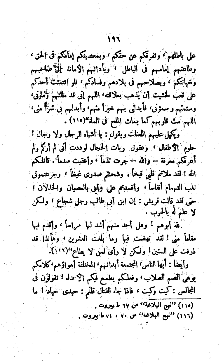 ويكيل عليهم اللعنات ويقول: يا أشباه الرجال ولا رجال! حلوم الأطفال، وعقول ربات الحجال لوددت أني لم أركم ولم أعرفكم معرفة - والله - جرت ندماً، وأعقبت سدماً. قاتلكم الله! لقد ملأتم قلبي قيحاً، وشحنتم صدري غيظاً، وجرعتموني نغب التهمام أنفاساً، وأفسدتم على رأيي بالعصيان والخذلان؛ حتى لقد قالت قريش: إن ابن أبي طالب رجل شجاع، ولكن لا علم له بالحرب.