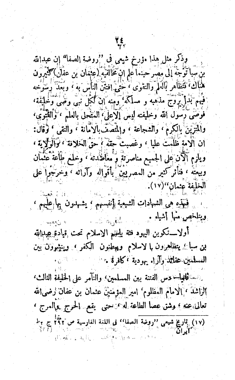 وذكر مثل هذا مؤرخ شيعي في "روضة الصفا" أن عبد الله بن سبا توجه إلى مصر حينما علم أن مخالفيه (عثمان بن عفان) كثيرون هناك، فتظاهر بالعلم والتقوى، حتى افتتن الناس به، وبعد رسوخه فيهم بدأ يروج مذهبه ومسلكه، ومنه أن لكل نبي وصي وخليفة، فوصى رسول الله وخليفته ليس غلا علي، المتحلي بالعلم، والفتوى، والمتزين بالكرم، والشجاعة، والمتصف بالأمانة، والتقى، وقال: أن الأمة ظلمت علياً، وغصبت حقه، حق الخلافة، والولاية، ويلزم الآن على الجميع مناصرته ومعاضدته، وخلع طاعة عثمان وبيعته، فتأثر كثير من المصريين بأقواله وآرائه، وخرجوا على الخليفة عثمان" (¬1).