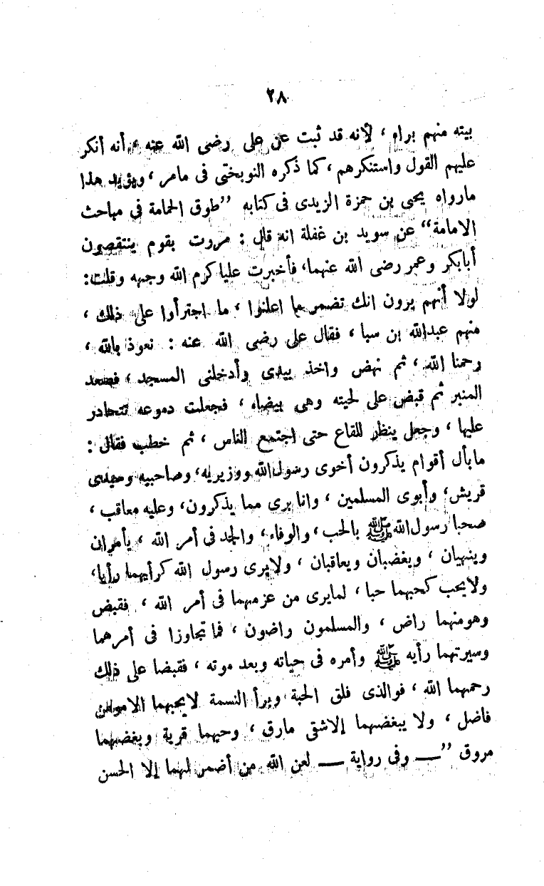 بيته منهم براء، لأنه قد ثبت عن علي رضي الله عنه، أنه أنكر عليهم القول واستنكرهم، كما ذكره النوبختي في ما مر، ويؤيد هذا ما رواه يحيى بن حمزة الزيدي في كتابه "طوق الحمامة في مباحث الإمامة" عن سويد بن غفلة أنه قال: مررت بقوم ينتقصون أبا بكر وعمر رضي الله عنهما، فأخبرت علياً كرم الله وجهه وقلت: لولا أنهم يرون أنك تضمر ما أعلنوا، ما اجترؤوا على ذلك، منهم عبد الله بن سبأ، فقال علي رضي الله عنه: نعوذ بالله، رحمنا الله، ثم نهض وأخذ بيدي وأدخلني المسجد، فصعد المنبر ثم قبض على لحيته وهي بيضاء، فجعلت دموعه تتحادر عليها، وجعل ينظر للقاع حتى اجتمع الناس، ثم خطبفقال: ما بال أقوام يذكرون أخوي رسول الله ووزيريه، وصاحبيه وسيدي قريش، وأبوي المسلمين، وأنا بريء مما يذكرون، وعليه معاقب، صحبا رسول الله بالحب، والوفاء، والجد في أمر الله، يأمران وينهيان، ويغضبان ويعاقبان، ولا يرى رسول الله كرأيهما رأياً، ولا يحب كحبهما حباً، لما يرى من عزمهما في أمر الله، فقبض وهو منهما راض، والمسلمون راضون، فما تجاوزا في أمرهما وسيرتهما رأيه وأمره في حياته وبعد موته، فقبضا على ذلك رحمهما الله، فوالذي فلق الحبة وبرا النسمة لا يحبهما إلا مؤمن فاضل، ولا يبغضهما إلا شقي مارق، وحبهما قربة وبغضهما مروق "- وفي رواية - لعن الله من أضمر لهما إلا الحسن
