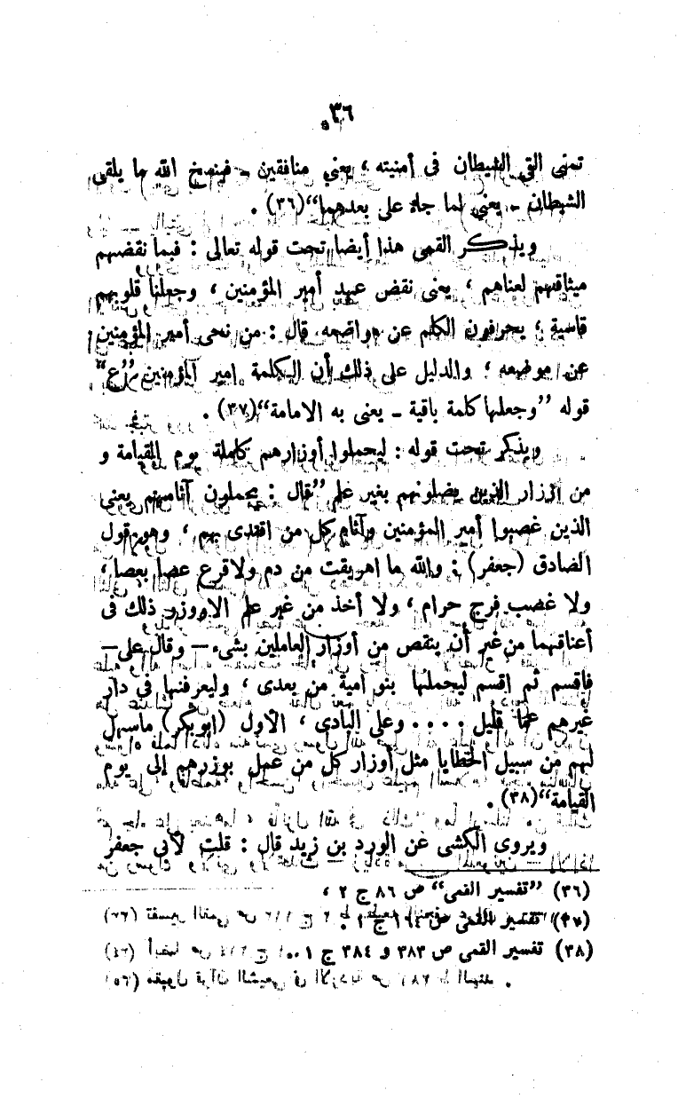 ويذكر تحت قوله: {ليحملوا أوزارهم كاملة يوم القيامة ومن أوزار الذين يضلونهم بغير علم} قال: يحملون آثامهم يعني الذين غضبوا أمير المؤمنين وآثام كل من اقتدى بهم، وهو قول الصادق (جعفر): والله ما أهريقت من دم ولا قرع عصا بعصا، ولا غصب فرج حرام، ولا أخذ من غير علم إلا ووزر ذلك في أعناقهما من غير أن ينقص من أوزار العاملين بشيء - وقال علي - فاقسم ثم اقسم ليحملنها بنو أمية من بعدي، وليعرفنها في دار غيرهم عما قليل. . . وعلى البادي، الأول (أبو بكر) ما سهل لهم من سبيل الخطايا مثل أوزار كل من عمل بوزرهم إلى يوم القيامة" (¬3).