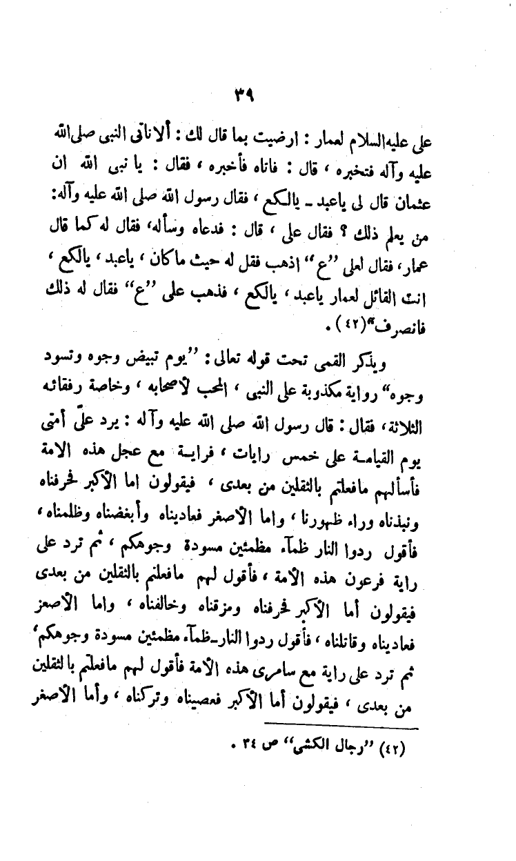 ويذكر القمي تحت قوله تعالى: "يوم تبيض وجوه وتسود وجوه" رواية مكذوبة على النبي، المحب لأصحابه، وخاصة رفقائه الثلاثة، فقال: قال رسول الله صلى الله عليه وآله: يرد على أمتي يوم القيامة على خمس رايات، فراية مع عجل هذه الأمة فأسألهم ما فعلتم بالثقلين من بعدي، فيقولون أما الأكبر فحرفناه ونبذناه وراء ظهورنا، وأما الأصغر فعاديناه وأبغضناه وظلمناه، فأقول ردوا النار ظمآء مظمئين مسودة وجوهكم، ثم ترد على راية فرعون هذه الأمة، فأقول لهم ما فعلتم بالثقلين من بعدي فيقولون أما الأكبر فحرفناه ومزقناه وخالفناه، وأما الأصغر فعاديناه وقاتلناه، فأقول ردوا النار - ظمآء مظمئين مسودة وجوهكم، ثم ترد على راية مع سامري هذه الأمة فأقول لهم ما فعلتم بالثقلين من بعدي، فيقولون أما الأكبر فعصيناه وتركناه، وأما الأصغر