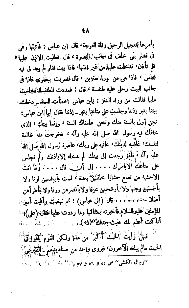 يأمرها بتعجيل الرحيل وقلة العرجة، قال ابن عباس: فأتيتها وهي في قصر بني خلف في جانب البصرة، قال فطلبت الإذن عليها فلم تأذن، فدخلت عليها من غير إذنها، فإذا بيت فقار لم يعد لي فيه مجلس، فإذا هي من وراء سترين، قال فضربت ببصري فإذا في جانب البيت رحل عليه طنفسة، قال: فمددت الطنفسة فجلست عليها فقالت من وراء الستر: يا ابن عباس أخطأت السنة - دخلت بيتنا بغير إذننا وجلست على متاعنا بغير إذننا - فقال لها ابن عباس: نحن أولى بالسنة منك ونحن علمناك السنة، وإنما بيتك، الذي خلفك فيه رسول الله صلى الله عليه وآله، فخرجت منه ظالمة لنفسك، غاشية لدينك، عاتبة على ربك، عاصية لرسول الله صلى الله عليه وآله، فإذا رجعت إلى بيتك لم ندخله إلا بإذنك ولم نجلس على متاعك إلا بأمرك. . . إلى أن قال. . . وما أنت إلا حشية من تسع حشايا خلفهن بعده، لست بأبيضهن لوناً ولا بأحسنهن وجهاً ولا بأرشحهن عرقاً ولا بأنضرهن ورقاً ولا بأطرأهن أصلاً. . . . . قال (ابن عباس): ثم نهضت وأتيت أمير المؤمنين عليه السلام فأخبرته بمقالتها وما رددت عليها فقال (علي): أنا كنت أعلم بك حيث بعثتك" (¬1).