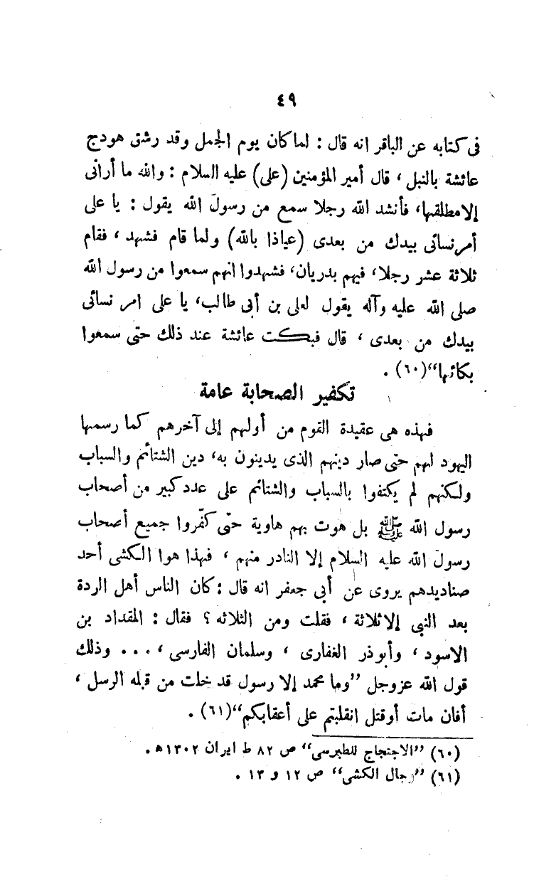 فهذه هي عقيدة القوم من أولهم إلى آخرهم كما رسمها اليهود لهم حتى صار دينهم الذي يدينون به، دين الشتائم والسباب ولكنهم لم يكتفوا بالسباب والشتائم على عدد كبير من أصحاب رسول الله بل هوت بهم هاوية حتى كفّروا جميع أصحاب رسول الله عليه السلام إلا النادر منهم، فهذا هو الكشي أحد صناديدهم يروي عن أبي جعفر أنه قال: كان الناس أهل الردة بعد النبي إلا ثلاثة، فقلت ومن الثلاثة؟ فقال: المقداد بن الأسود، وأبو ذر الغفاري، وسلمان الفارسي،. . . وذلك قول الله عز وجل {وما محمد إلا رسول قد خلت من قبله الرسل، أفإن مات أو قتل انقلبتم على أعقابكم} (¬2).