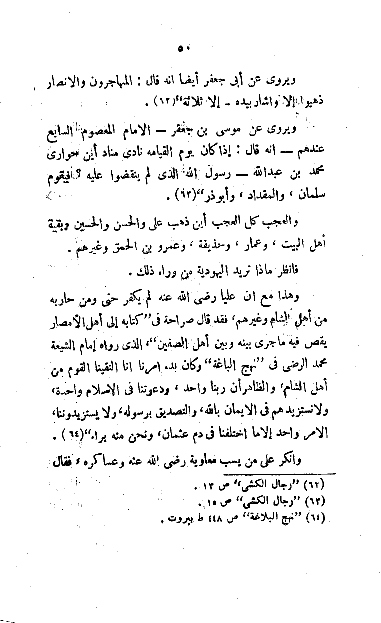 وهذا مع أن علياً رضي الله عنه لم يكفر حتى ومن حاربه من أهل الشام وغيرهم، فقد قال صراحة في "كتابه إلى أهل الأمصار يقص فيه ما جرى بينه ويبن أهل الصفين"، الذي رواه إمام الشيعة محمد الرضى في "نهج الباغة" وكان بدء أمرنا أنا التقينا القوم من أهل الشام، والظاهر أن ربنا واحد، ودعوتنا في الإسلام واحدة، ولا نستزيدهم في الإيمان بالله، والتصديق برسوله، ولا يستزيدوننا، الأمر واحد إلا ما اختلفنا في دم عثمان، ونحن منه براء" (¬3).