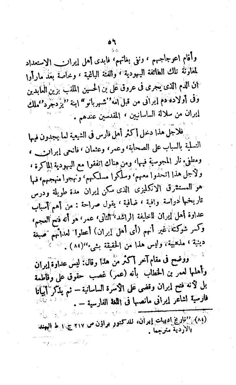 ووضح في مقام آخر أكثر من هذا وقال: ليس عداوة إيران وأهلها لعمر بن الخطاب بأنه (عمر) غصب حقوق علي وفاطمة بل لأنه فتح إيران وقضى على الأسرة الساسانية - ثم يذكر أبياتاً فارسية لشاعر إيراني ما نصها في اللغة الفارسية -.