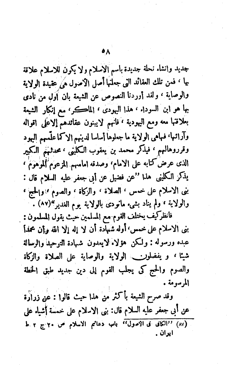 جديد وإنشاء نحلة جديدة باسم الإسلام ولا يكون للإسلام علاقة بها، فمن تلك العقائد التي جعلتها أصل الأصول هي عقيدة الولاية والوصاية، ولقد أوردنا النصوص عن الشيعة بأن أول نم نادى بها هو ابن السوداء، هذا اليهودي، الماكر، مع إنكار الشيعة بعلاقتها معه ومع اليهودية، فإنهم لا يبنون عقائدهم إلا على أقواله وآرائها، فها هي الولاية ما جعلوها أساساً لدينهم إلا كما علمهم اليهود وقرروها لهم، فيذكر محمد بن يعقوب الكليني، محدثهم الكبير الذي عرض كتابه على الإمام، وصدقه إمامهم المزعوم الموهوم، يذكر الكليني هذا "عن فضيل عن أبي جعفر عليه السلام قال: بنى الإسلام على خمس، الصلاة، والزكاة، والصوم، والحج، والولاية، ولم يناد بشيء ما نودي بالولاية يوم الغدير" (¬1).