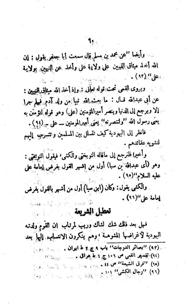 وأخيراً فلنرجع إلى ما قاله النوبختي والكشي، فيقول النوبختي: وهو (أي عبد الله بن سبأ) أول من أشهر القول بفرض إمامة علي عليه السلام" (¬3).