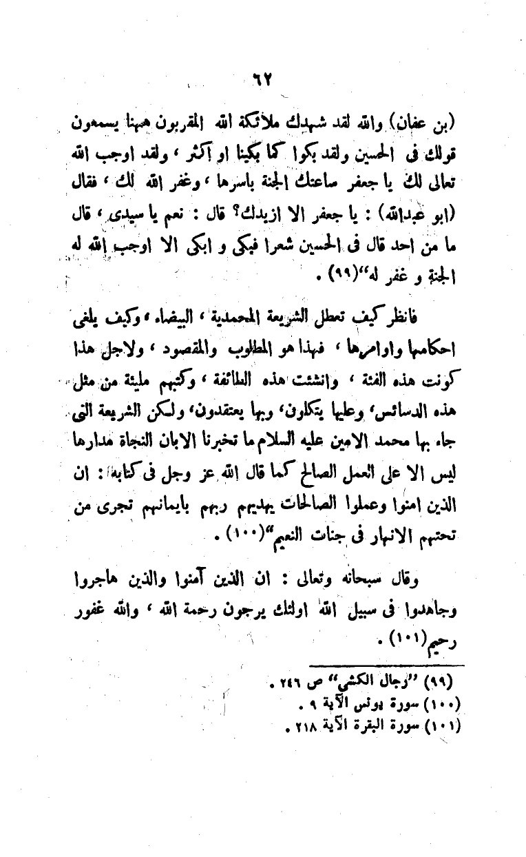 فانظر كيف تعطل الشريعة المحمدية، البيضاء، وكيف يلغي أحكامها وأوامرها، فهذا هو المطلوب والمقصود، ولأجل هذا كونت هذه الفئة، وأنشئت هذه الطائفة، وكتبهم مليئة من مثل هذه الدسائس، وعليها يتكلون، وبها يعتقدون، ولكن الشريعة التي جاء بها محمد الأمين عليه السلام ما تخبرنا إلا بأن النجاة مدارها ليس إلا على العمل الصالح كما قال الله عز وجل في كتابه: {إن الذين آمنوا وعملوا الصالحات يهديهم ربهم بإيمانهم تجري من تحتهم الأنهار في جنات النعيم} (¬2).