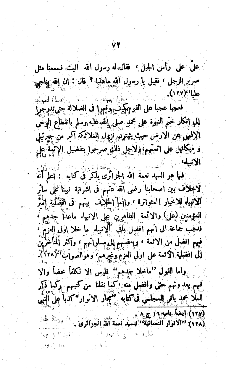 فها هو السيد نعمة الله الجزائري يذكر في كتابه: اعلم أنه لا خلاف بين أصحابنا رضي الله عنهم في أشرفية نبينا على سائر الأنبياء للأخبار المتواترة، وإنما الخلاف بينهم في أفضلية أمير المؤمنين (علي) والأئمة الطاهرين على الأنبياء ما عدا جدهم، فذهب جماعة إلى أنهم أفضل باقي الأنبياء ما خلا أولي العزم، فهم أفضل من الأئمة، وبعضهم إلى مساواتهم، وأكثر المتأخرين إلى أفضلية الأئمة على أولي العزم وغيرهم، وهو الصواب" (¬2).