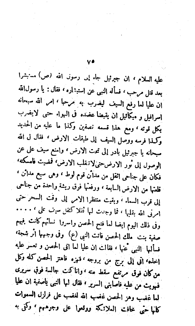 رضي الله عنه، إن جبرئيل جاء إلى رسول الله مستبشراً بعد قتل مرحب، فسأله النبي عن استبشاره، فقال: يا رسول الله إن علياً لما رفع السيف ليضرب به مرحباً، أمر الله سبحانه إسرافيل وميكائيل أن يقبضا عضده في الهواء حتى لا يضرب بكل قوته، ومع هذا قسمه نصفين وكذا ما عليه من الحديد وكذا فرسه ووصل السيف إلى طبقات الأرض، فقال لي الله سبحانه يا جبرئيل بادر إلى تحت الأرض، وامنع سيف علي عن الوصول إلى ثور الأرض حتى لا تقلب الأرض، فمضيت فأمسكته، فكان على جناحي أثقل من مدائن قوم لوط، وهي سبع مدائن، قلعتها من الأرض السابعة، ورفعتها فوق ريشة واحدة من جناحي إلى قرب السماء، وبقيت منتظراً الأمر إلى وقت السحر حتى أمرني الله بقلبها، فما وجدت لها ثقلاً كثقل سيف علي،. . . وفي ذلك اليوم أيضاً لما فتح الحصن وأسروا نسائهم كانت فيهم صفية بنت ملك الحصن فأتت النبي وفي وجهها أثر شجة، فسألها النبي عنها، فقالت أن علياً لما أتى الحصن وتعسر عليه أخذه، أتى إلى برج من بروجه، فنهزه فاهتز الحصن كله وكل من كان فوق مرتفع سقط منه، وأنا كنت جالسة فوق سريري فهويت من عليه فأصابني السرير، فقال لها النبي يا صفية إن علياً لما غضب وهز الحصن غضب الله لغضب علي فزلزل السماوات كلها حتى خافت الملائكة ووقعوا على وجوههم، وكفى به