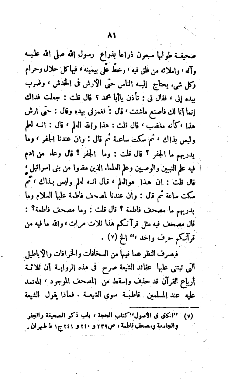 (¬1) "الكافي في الأصول" كتاب الحجة، باب ذكر الصحيفة والجفر والجامعة ومصحف فاطمة، ص239 و240 و241 ج1 ط طهران