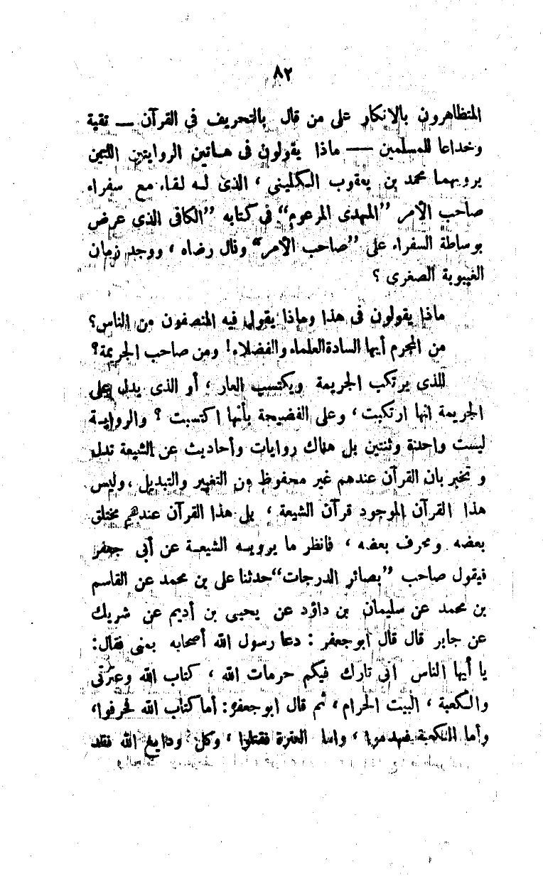الذي يرتكب الجريمة ويكتسب العار، أو الذي يدل على الجريمة أنها ارتكبت، وعلى الفضيحة بأنها اكتسبت؟ والرواية ليست واحدة واثنتين بل هناك روايات وأحاديث عن الشيعة تدل وتخبر بأن القرآن عندهم غير محفوظ من التغيير والتبديل، وليس هذا القرآن الموجود قرآن الشيعة، بل هذا القرآن عندهم مختلق بعضه ومحرف بعضه، فانظر ما يرويه الشيعة عن أبي جعفر فيقول صاحب "بصائر الدرجات" حدثنا علي بن محمد عن القاسم بن محمد بن سليمان بن داؤد عن يحيى بن أديم عن شريك عن جابر قال قال أبو جعفر: دعا رسول الله أصحابه بمنى فقال: يا أيها الناس إني تارك فيكم حرمات الله، كتاب الله وعترتي والكعبة، البيت الحرام، ثم قال أبو جعفر: أما كتاب الله فحرفوا، وأما الكعبة فهدموا، وأما العترة فاقتلوا، وكل ودايع الله فقد