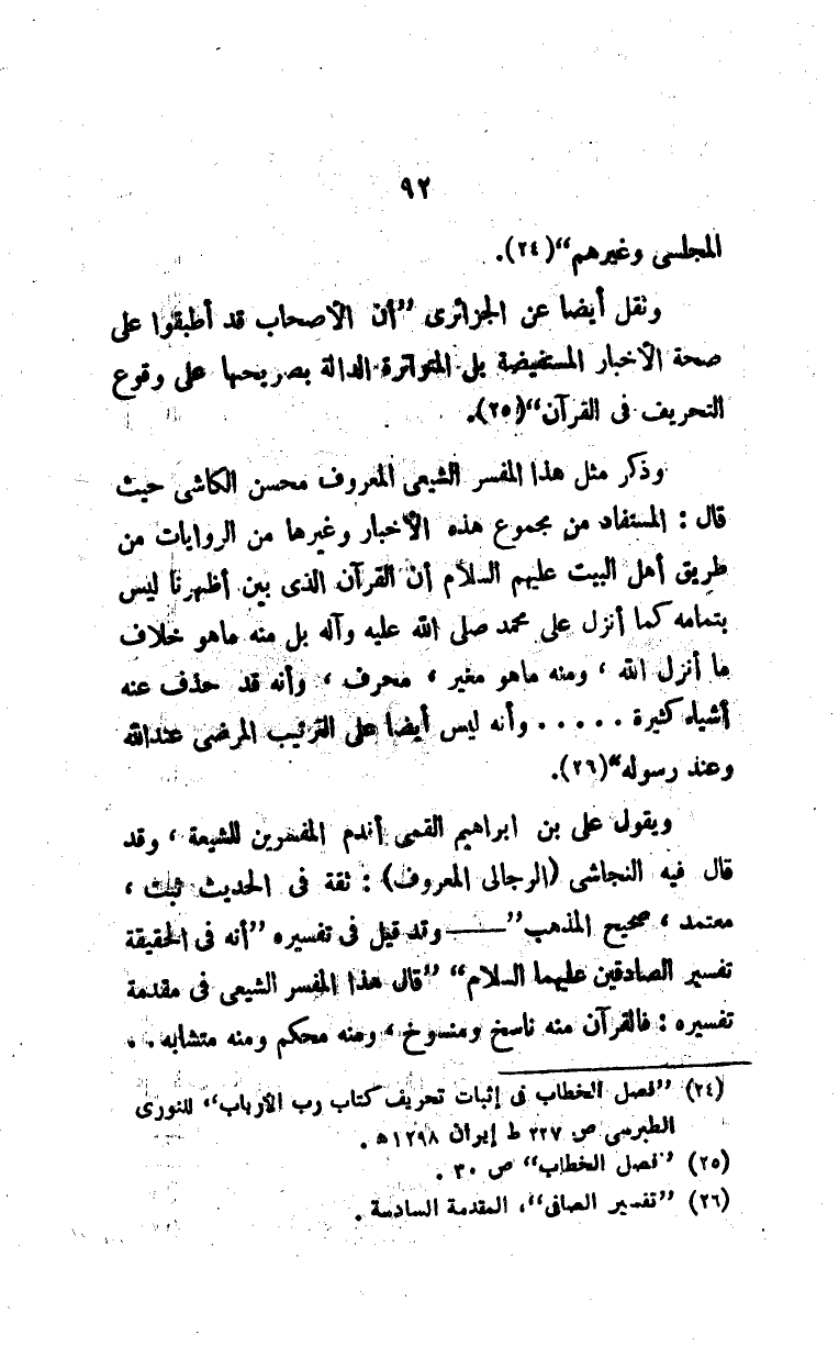وقال عالم شيعي الذي علق على تفسير القمي ذاكراً أقوال العلماء في تحريف القرآن "ولكن الظاهر من كلمات غيرهم من العلماء والمحدثين، المتقدمين منهم والمتأخرين، القول بالنقيصة كالكليني، والبرقي، والعياشي، والنعماني، وفرات بن إبراهيم، وأحمد بن أبي طالب الطبرسي، والمجلسي، والسيد الجزائري، والحر العاملي، والعلامة