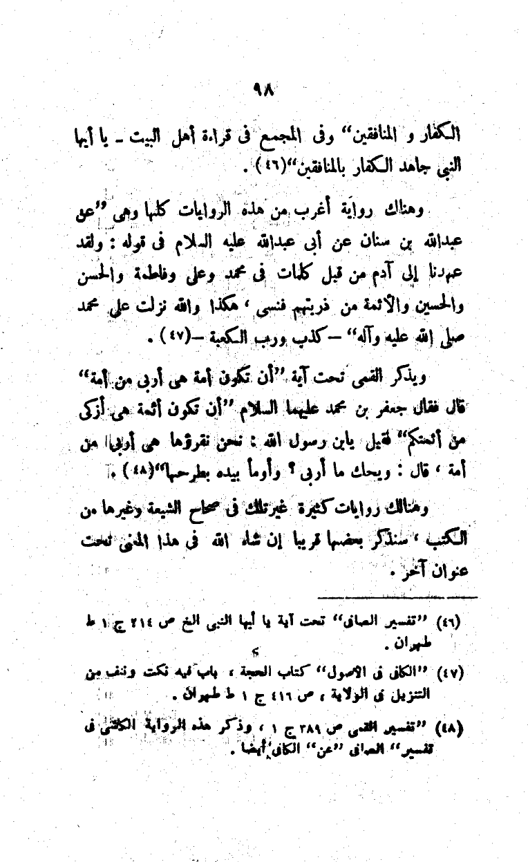 ويذكر القمي تحت آية "أن تكون أمة هي أربى من أمة" قال فقال جعفر بن محمد عليهما السلام "أن تكون أثمة هي أزكى من أثمتكم" فقيل يا ابن رسول الله: نحن نقرؤها هي أربى من أمة، قال: ويحك ما أربى؟ وأومأ بيده بطرحها" (¬3).