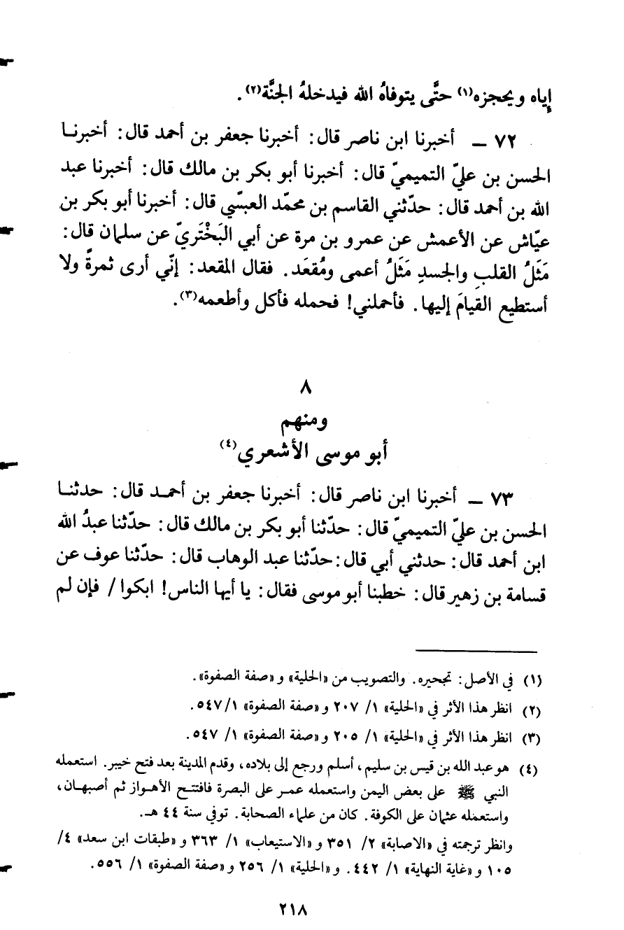 73 - أَخْبَرَنَا ابْنُ نَاصِرٍ قَالَ: أَخْبَرَنَا جَعْفَرُ بْنُ أَحْمَدَ قَالَ: حَدَّثَنَا الْحَسَنُ بْنُ عَلِيٍّ التَّمِيمِيُّ قَالَ: حَدَّثَنَا أَبُو بَكْرِ بْنُ مَالِكٍ قَالَ: حَدثنَا عبد الله ابْن أَحْمَدَ قَالَ: حَدَّثَنِي أَبِي قَالَ: حَدَّثَنَا عَبْدُ الْوَهَّابِ قَالَ: حَدَّثَنَا عَوْفٌ عَنْ قِسَامَةَ بْنِ زُهَيْرٍ قَالَ: خَطَبَنَا أَبُو مُوسَى فَقَالَ: يَا أَيُّهَا النَّاسُ} ابْكُوا / فَإِنْ لَمْ