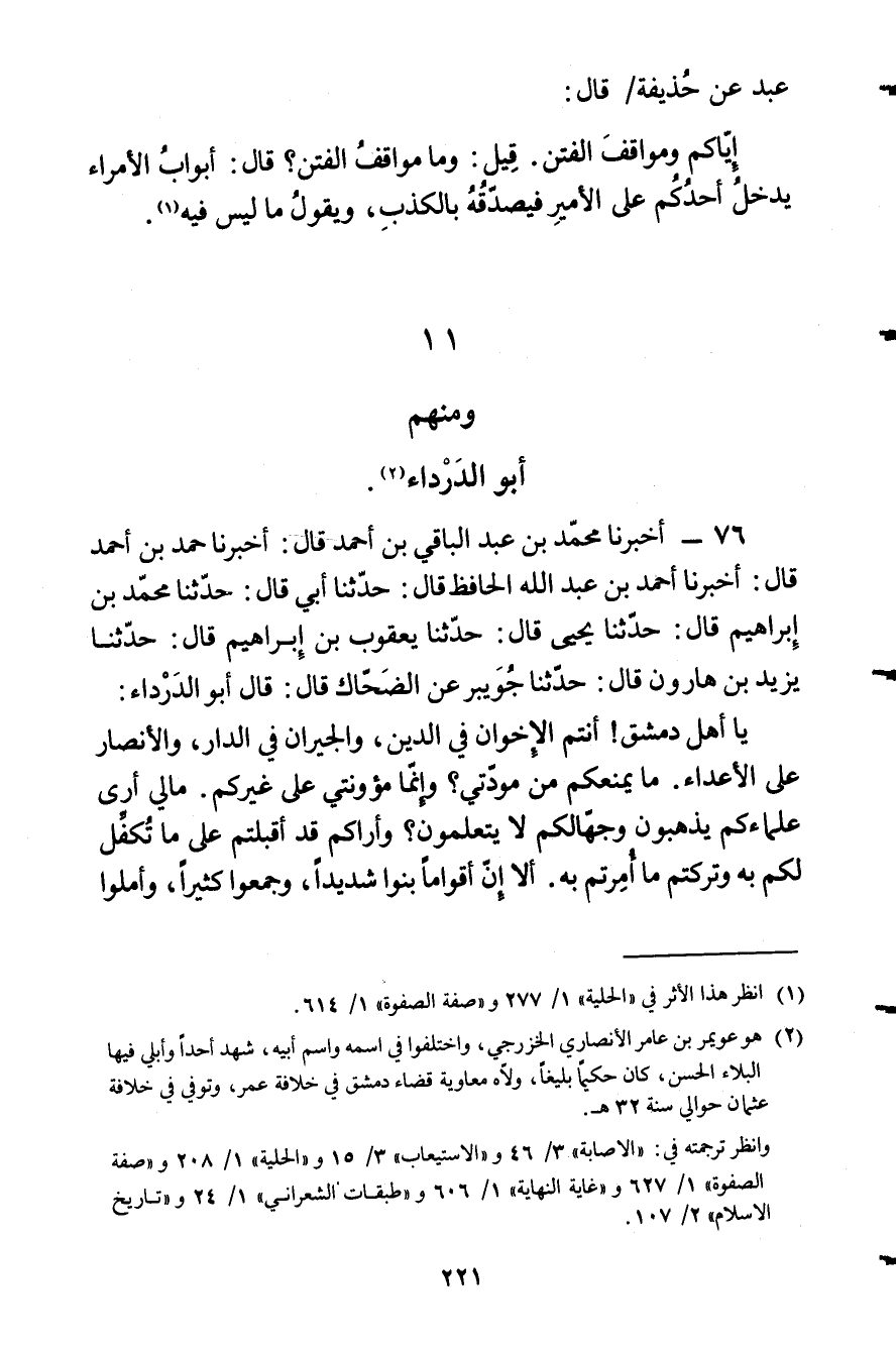 76 - أخبرنَا مُحَمَّد بن عبد الْبَاقِي بن أَحْمد قَالَ: أَخْبَرَنَا حَمَدُ بْنُ أَحْمَدَ قَالَ: أَخْبَرَنَا أَحْمَدُ بْنُ عَبْدِ اللَّهِ الْحَافِظُ قَالَ: حَدَّثَنَا أَبِي قَالَ: حَدَّثَنَا مُحَمَّدُ بْنُ إِبْرَاهِيمَ قَالَ: حَدَّثَنَا يَحْيَى قَالَ: حَدَّثَنَا يَعْقُوبُ بْنُ إِبْرَاهِيمَ قَالَ: حَدثنَا يزِيد بن هَارُون قَالَ: حَدثنَا جُوَيْبِرٌ عَنِ الضَّحَّاكِ قَالَ: قَالَ أَبُو الدَّرْدَاءِ: يَا أَهْلَ دِمَشْقَ! أَنْتُمُ الْإِخْوَانُ فِي الدِّينِ، وَالْجِيرَانُ فِي الدَّارِ، وَالْأَنْصَارُ عَلَى الْأَعْدَاءِ. مَا يمنعكم من مودتي؟ وَإِنَّمَا مؤونتي عَلَى غَيْرِكُمْ. مَالِي أَرَى عُلَمَاءَكُمْ يَذْهَبُونَ وَجُهَّالَكُمْ لَا يَتَعَلَّمُونَ؟ وَأَرَاكُمْ قَدْ أَقْبَلْتُمْ عَلَى مَا تُكُفِّلَ لَكُمْ بِهِ وَتَرَكْتُمْ مَا أُمِرْتُمْ بِهِ. أَلَا إِنَّ أَقْوَامًا بَنَوْا شَدِيدًا، وَجَمَعُوا كَثِيرًا، وأملوا