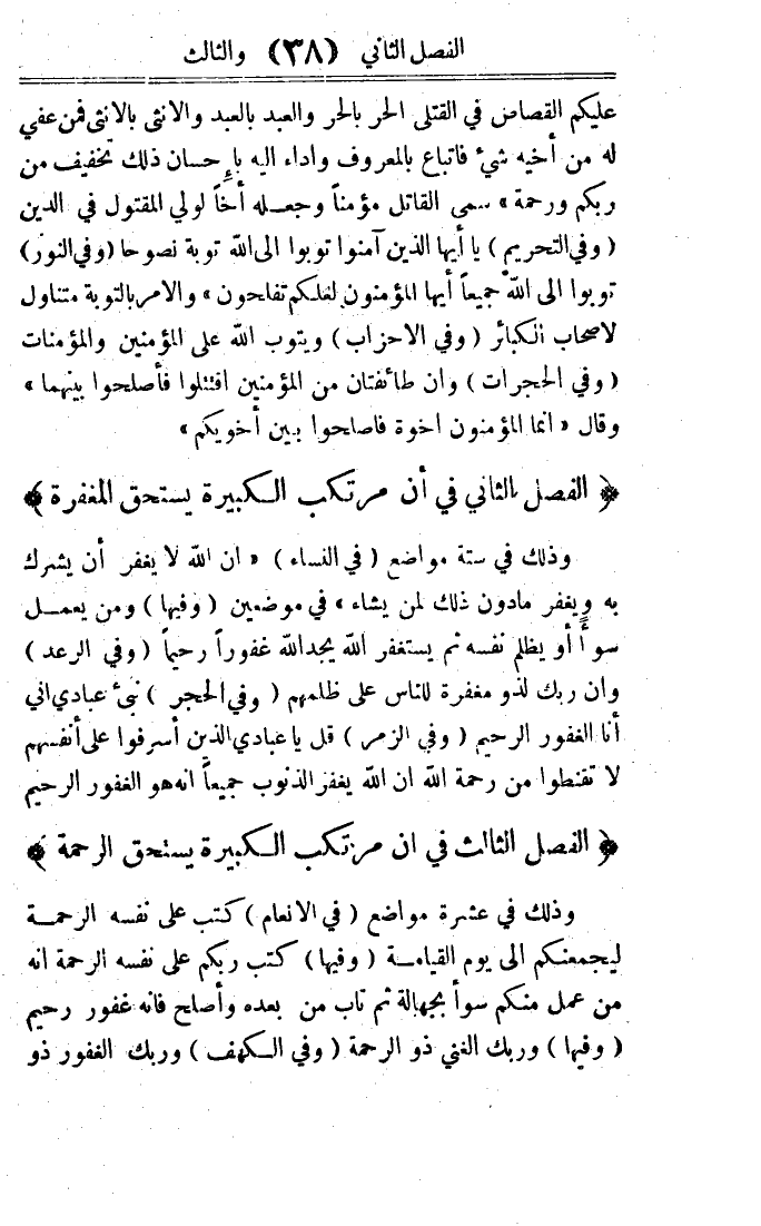 عَلَيْكُم الْقصاص فِي الْقَتْلَى الْحر بِالْحرِّ وَالْعَبْد بِالْعَبدِ وَالْأُنْثَى بِالْأُنْثَى فَمن عُفيَ لَهُ من أَخِيه شَيْء فاتباع بِالْمَعْرُوفِ وَأَدَاء إِلَيْهِ بِإِحْسَان ذَلِك تَخْفيف من ربكُم وَرَحْمَة سمى الْقَاتِل مُؤمنا وَجعله اخا لوَلِيّ الْمَقْتُول فِي الدّين وَفِي التَّحْرِيم (يَا أَيهَا الَّذين آمنُوا تُوبُوا إِلَى الله تَوْبَة نصُوحًا وَفِي النُّور (وتوبوا إِلَى الله جَمِيعًا أَيهَا الْمُؤْمِنُونَ لَعَلَّكُمْ تفلحون والامر بِالتَّوْبَةِ متناول لاصحاب الْكَبَائِر وَفِي الاحزاب (وَيَتُوب الله على الْمُؤمنِينَ وَالْمُؤْمِنَات وَفِي الحجرات (وَإِن طَائِفَتَانِ من الْمُؤمنِينَ اقْتَتَلُوا فأصلحوا بَينهمَا وَقَالَ (إِنَّمَا الْمُؤْمِنُونَ إخْوَة فأصلحوا بَين أخويكم)