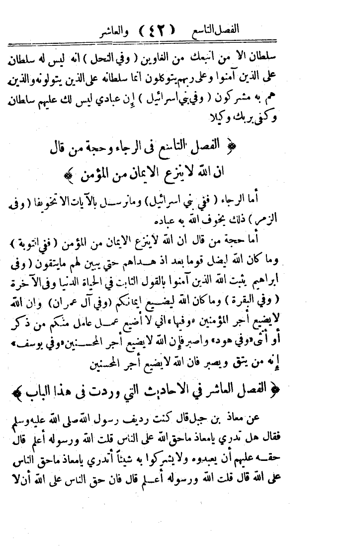 الْفَصْل التَّاسِع فِي الرَّجَاء وَحجَّة من قَالَ ان الله لَا ينْزع الايمان من الْمُؤمن