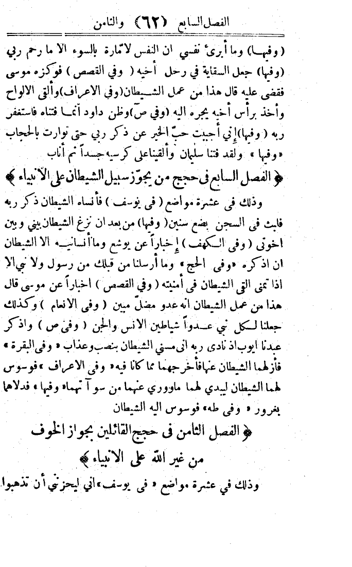 الْفَصْل السَّابِع فِي حجج من يجوز سَبِيل الشَّيْطَان على الْأَنْبِيَاء