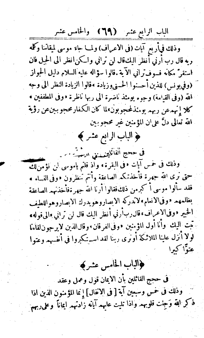 وَذَلِكَ فِي خمس آيَات فِي الْبَقَرَة (وَإِذ قُلْتُمْ يَا مُوسَى لن نؤمن لَك حَتَّى نرى الله جهرة فأخذتكم الصاعقة وَأَنْتُم تنْظرُون وَفِي النِّسَاء (فقد سَأَلُوا مُوسَى أكبر من ذَلِك فَقَالُوا أرنا الله جهرة فَأَخَذتهم الصاعقة بظلمهم وَفِي الْأَنْعَام (لَا تُدْرِكهُ الْأَبْصَار وَهُوَ يدْرك الْأَبْصَار وَهُوَ اللَّطِيف الْخَبِير) وَفِي الاعراف (قَالَ رب أَرِنِي أنظر إِلَيْك قَالَ لن تراني الى قَوْله (تبت إِلَيْك وَأَنا أول الْمُؤمنِينَ) وَفِي الْفرْقَان (وَقَالَ الَّذين لَا يرجون لقاءنا لَوْلَا أنزل علينا الْمَلَائِكَة أَو نرى رَبنَا لقد استكبروا فِي أنفسهم وعتوا عتوا كَبِيرا - صَلَّى اللَّهُ عَلَيْهِ وَسَلَّم َ - الْبَاب الْخَامِس عشر فِي حجج الْقَائِلين بِأَن الايمان قَول وَعمل وَعقد - صَلَّى اللَّهُ عَلَيْهِ وَسَلَّم َ -