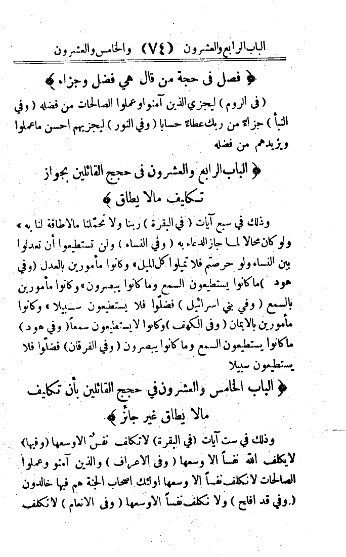 وَذَلِكَ فِي سبع آيَات فِي الْبَقَرَة {رَبنَا وَلَا تحملنا مَا لَا طَاقَة لنا بِهِ} وَلَو كَانَ محالا لما جَازَ الدُّعَاء بِهِ وَفِي النِّسَاء {وَلنْ تستطيعوا أَن تعدلوا بَين النِّسَاء وَلَو حرصتم فَلَا تميلوا كل الْميل} وَكَانُوا مأمورين بِالْعَدْلِ وَفِي هود {مَا كَانُوا يَسْتَطِيعُونَ السّمع وَمَا كَانُوا يبصرون} وَكَانُوا مامورين بِالسَّمْعِ وَفِي بني اسرائيل {فضلوا فَلَا يَسْتَطِيعُونَ سَبِيلا} وَكَانُوا مامورين بالايمان وَفِي الْكَهْف {وَكَانُوا لَا يَسْتَطِيعُونَ سمعا} وَفِي هود {مَا كَانُوا يَسْتَطِيعُونَ السّمع وَمَا كَانُوا يبصرون} وَفِي الْفرْقَان {فضلوا فَلَا يَسْتَطِيعُونَ سَبِيلا} - صَلَّى اللَّهُ عَلَيْهِ وَسَلَّم َ - الْبَاب الْخَامِس وَالْعشْرُونَ فِي حجج الْقَائِلين بَان تَكْلِيف مَالا يُطَاق غير جَائِز - صَلَّى اللَّهُ عَلَيْهِ وَسَلَّم َ -