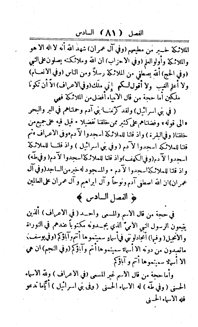 فِي حجَّة من قَالَ الِاسْم والمسمى وَاحِد فِي الاعراف {الَّذين يتبعُون الرَّسُول النَّبِي الْأُمِّي الَّذِي يجدونه مَكْتُوبًا عِنْدهم فِي التَّوْرَاة وَالْإِنْجِيل} وفيهَا {أتجادلونني فِي أَسمَاء سميتموها أَنْتُم وآباؤكم} وَفِي يُوسُف {مَا تَعْبدُونَ من دونه إِلَّا أَسمَاء سميتموها أَنْتُم وآباؤكم} وَفِي النَّجْم {إِن هِيَ إِلَّا أَسمَاء سميتموها أَنْتُم وآباؤكم}
